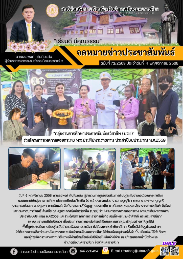 วันที่ 4 พฤศจิกายน 2568 นายเลอพงศ์ ทับทิมแสน ผู้อำนวยการศูนย์ส่งเสริมการเรียนรู้ระดับอำเภอเมืองนครราชสีมา มอบหมายให้กลุ่มงานการศึกษาประกาศนียบัตรวิชาชีพ (ปวช.) ประกอบด้วย นางสาวบุญจิรา ชาพล นายทศพล บุญศรี นางสาวลภัสรดา ตอมพุดซา นายพัชพงศ์ ดีแป้น นางสาวปิรัญญา พจนะเวทิน นางวิภาพร ชนะวรรณโณ นางสาวพรทิพย์ นิ่มใหม่ และนางสาวปภาวรินทร์ สันตธีระกุล ครูประกาศนียบัตรวิชาชีพ (ปวช.) ร่วมโครงการเทศกาลลอยกระทง พระประทีปพระราชทาน ประจำปีงบประมาณ พ.ศ.2569 และร่วมจัดนิทรรศการพระราชกรณียกิจ สมเด็จพระนางเจ้าสิริกิติ์ พระบรมราชินีนาถ พระบรมราชชนนีพันปีหลวง เพื่อน้อมถวายความอาลัยด้วยสำนึกในพระมหากรุณาธิคุณอย่างหาที่สุดมิได้ ทั้งนี้ศูนย์ส่งเสริมการเรียนรู้ระดับอำเภอเมืองนครราชสีมา ยังได้สอนการทำเข็มกลัดจากริบบิ้นสีดำในรูปแบบต่างๆให้กับประชาชนที่มาร่วมงานโดยทางสกร.ระดับอำเภอเมืองนครราชสีมา ได้จัดเตรียมอุปกรณ์ทั้งริบบิ้น เข็มกลัด ไว้ให้บริการ และผู้ร่วมกิจกรรมสามารถนำชิ้นงานที่ทำเสร็จแล้วกลับไปได้โดยไม่เสียค่าใช้จ่าย ณ บริเวณตลาดน้ำบึงหัวทะเล อำเภอเมืองนครราชสีมา จังหวัดนครราชสีมา