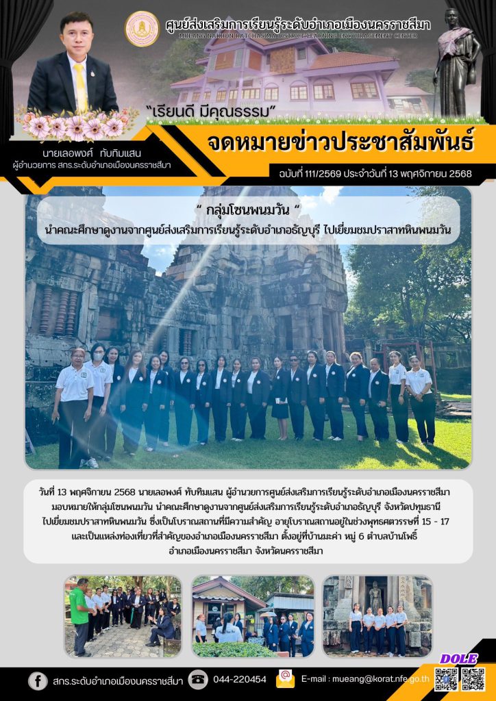 วันที่ 13 พฤศจิกายน 2568 นายเลอพงศ์ ทับทิมแสน ผู้อำนวยการศูนย์ส่งเสริมการเรียนรู้ระดับอำเภอเมืองนครราชสีมา มอบหมายให้กลุ่มโซนพนมวัน นำคณะศึกษาดูงานจากศูนย์ส่งเสริมการเรียนรู้ระดับอำเภอธัญบุรี จังหวัดปทุมธานี ไปเยี่ยมชมปราสาทหินพนมวัน ซึ่งเป็นโบราณสถานที่มีความสำคัญ อายุโบราณสถานอยู่ในช่วงพุทธศตวรรษที่ 15-17 และเป็นแหล่งท่องเที่ยวที่สำคัญของอำเภอเมืองนครราชสีมา ตั้งอยู่ที่บ้านมะค่า หมู่ 6 ตำบลบ้านโพธิ์ อำเภอเมืองนครราชสีมา จังหวัดนครราชสีมา