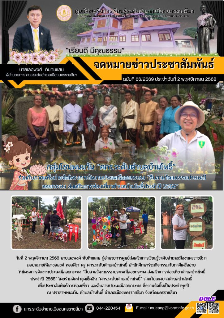 วันที่ 2 พฤศจิกายน 2568 นายเลอพงศ์ ทับทิมแสน ผู้อำนวยการศูนย์ส่งเสริมการเรียนรู้ระดับอำเภอเมืองนครราชสีมา มอบหมายให้นางอนงค์ ทองพีระ ครู ศกร.ระดับตำบลบ้านโพธิ์ นำนักศึกษาร่วมกิจกรรมกับภาคีเครือข่ายในโครงการจัดงานประเพณีลอยกระทง “สืบสานวัฒนธรรมประเพณีลอยกระทง ส่งเสริมการท่องเที่ยวตำบลบ้านโพธิ์ประจำปี 2568” โดยร่วมจัดทำจุดเช็คอิน “ศกร.ระดับตำบลบ้านโพธิ์” ร่วมกับเทศบาลตําบลบ้านโพธิ์ เพื่อประชาสัมพันธ์การท่องเที่ยว และสืบสานประเพณีลอยกระทง ซึ่งงานจัดขึ้นเป็นประจำทุกปี ณ ปราสาทพนมวัน ตำบลบ้านโพธิ์ อำเภอเมืองนครราชสีมา จังหวัดนครราชสีมา