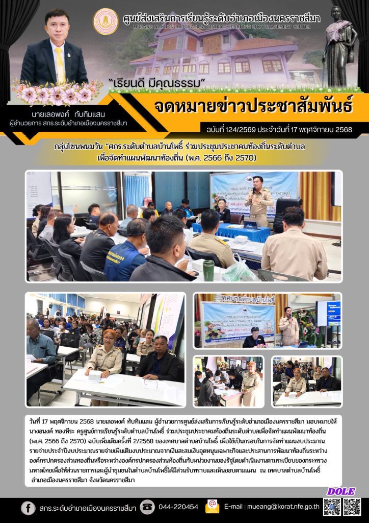 วันที่ 17 พฤศจิกายน 2568 นายเลอพงศ์ ทับทิมแสน ผู้อำนวยการศูนย์ส่งเสริมการเรียนรู้ระดับอำเภอเมืองนครราชสีมา มอบหมายให้นางอนงค์ ทองพีระ ครูศูนย์การเรียนรู้ระดับตำบลบ้านโพธิ์ ร่วมประชุมประชาคมท้องถิ่นระดับตำบลเพื่อจัดทำแผนพัฒนาท้องถิ่น (พ.ศ. 2566 ถึง 2570) ฉบับเพิ่มเติมครั้งที่ 2/2568 ของเทศบาลตำบลบ้านโพธิ์ เพื่อใช้เป็นกรอบในการจัดทำแผนงบประมาณรายจ่ายประจำปีงบประมาณรายจ่ายเพิ่มเติมงบประมาณจากเงินสะสมเงินอุดหนุนเฉพาะกิจและประสานการพัฒนาท้องถิ่นระหว่างองค์กรปกครองส่วนทองถิ่นหรือระหว่างองค์กรปกครองส่วนท้องถิ่นกับหน่วยงานของรัฐโดยดำเนินงานตามระเบียบของกระทรวงมหาดไทยเพื่อให้ส่วนราชการและผู้นำชุมชนในตำบลบ้านโพธิ์ได้มีส่วนรับทราบและเห็นชอบตามแผน ณ เทศบาลตำบลบ้านโพธิ์ อำเภอเมืองนครราชสีมา จังหวัดนครราชสีมา