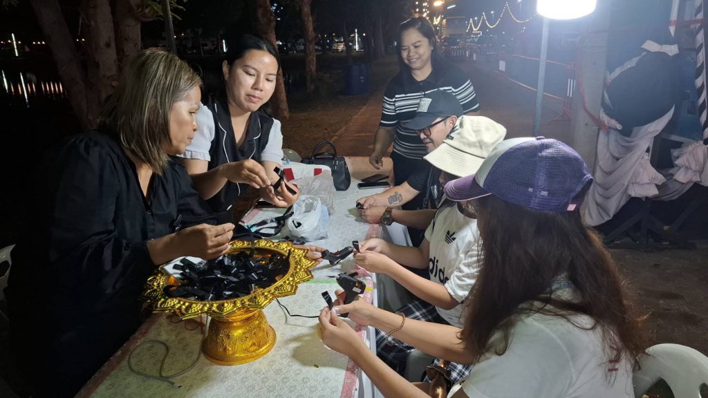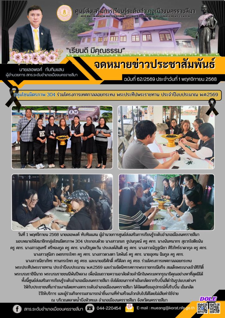 วันที่ 1 พฤศจิกายน 2568 นายเลอพงศ์ ทับทิมแสน ผู้อำนวยการศูนย์ส่งเสริมการเรียนรู้ระดับอำเภอเมืองนครราชสีมา มอบหมายให้สมาชิกกลุ่มโซนมิตรภาพ 304 ประกอบด้วย นางสาวภมร ฐปนกุลณ์ ครู ศกร. นางนันทนากร สุขวรโชติธนัน ครู ศกร. นางสาวสุนทรี ศรีทองกูล ครู ศกร. นางปัญตะวัน ประสงค์สันติ ครู ศกร. นางสาวณัฎฐณิชา ศิริภัทร์ธาดากุล ครู ศกร. นางสาวสุนิสา เพชรกระโทก ครู ศกร. นางสาวดวงตา โสพันธ์ ครู ศกร. นายอุเทน ฉิมกูล ครู ศกร. นางสาวณิชาภัทร ทานกระโทก ครู ศรช. และนายอธิศักดิ์ ศรีดิลก ครู ศรช. ร่วมโครงการเทศกาลลอยกระทง พระประทีปพระราชทาน ประจำปีงบประมาณ พ.ศ.2569 และร่วมจัดนิทรรศการพระราชกรณียกิจ สมเด็จพระนางเจ้าสิริกิติ์ พระบรมราชินีนาถ พระบรมราชชนนีพันปีหลวง เพื่อน้อมถวายความอาลัยด้วยสำนึกในพระมหากรุณาธิคุณอย่างหาที่สุดมิได้ ทั้งนี้ศูนย์ส่งเสริมการเรียนรู้ระดับอำเภอเมืองนครราชสีมา ยังได้สอนการทำเข็มกลัดจากริบบิ้นสีดำในรูปแบบต่างๆ ให้กับประชาชนที่มาร่วมงาน โดยทางสกร.ระดับอำเภอเมืองนครราชสีมา ได้จัดเตรียมอุปกรณ์ทั้งริบบิ้น เข็มกลัด ไว้ให้บริการ และผู้ร่วมกิจกรรมสามารถนำชิ้นงานที่ทำเสร็จแล้วกลับไปได้โดยไม่เสียค่าใช้จ่าย ณ บริเวณตลาดน้ำบึงหัวทะเล อำเภอเมืองนครราชสีมา จังหวัดนครราชสีมา