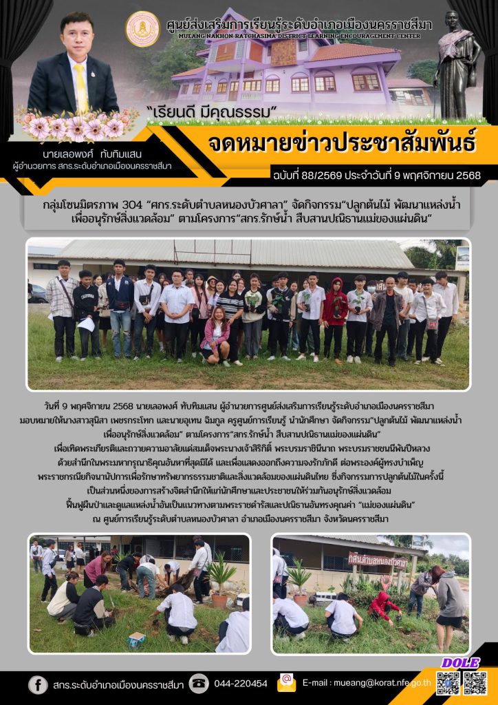 วันที่ 9 พฤศจิกายน 2568 นายเลอพงศ์ ทับทิมแสน ผู้อำนวยการศูนย์ส่งเสริมการเรียนรู้ระดับอำเภอเมืองนครราชสีมา มอบหมายให้นางสาวสุนิสา เพชรกระโทก และนายอุเทน ฉิมกูล ครูศูนย์การเรียนรู้ นำนักศึกษา จัดกิจกรรม“ปลูกต้นไม้ พัฒนาแหล่งน้ำเพื่ออนุรักษ์สิ่งแวดล้อม” ตามโครงการ“สกร.รักษ์น้ำ สืบสานปณิธานแม่ของแผ่นดิน”เพื่อเทิดพระเกียรติและถวายความอาลัยแด่สมเด็จพระนางเจ้าสิริกิติ์ พระบรมราชินีนาถ พระบรมราชชนนีพันปีหลวงด้วยสำนึกในพระมหากรุณาธิคุณอันหาที่สุดมิได้ และเพื่อแสดงออกถึงความจงรักภักดี ต่อพระองค์ผู้ทรงบำเพ็ญพระราชกรณียกิจนานัปการเพื่อรักษาทรัพยากรธรรมชาติและสิ่งแวดล้อมของแผ่นดินไทย ซึ่งกิจกรรมการปลูกต้นไม้ในครั้งนี้เป็นส่วนหนึ่งของการสร้างจิตสำนึกให้แก่นักศึกษาและประชาชนให้ร่วมกันอนุรักษ์สิ่งแวดล้อม ฟื้นฟูผืนป่าและดูแลแหล่งน้ำอันเป็นแนวทางตามพระราชดำรัสและปณิธานอันทรงคุณค่า “แม่ของแผ่นดิน”