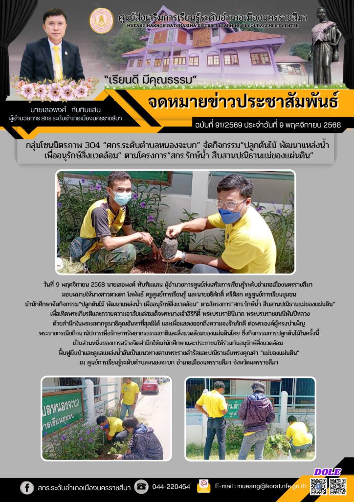 วันที่ 9 พฤศจิกายน 2568 นายเลอพงศ์ ทับทิมแสน ผู้อำนวยการศูนย์ส่งเสริมการเรียนรู้ระดับอำเภอเมืองนครราชสีมา มอบหมายให้นางสาวดวงตา โสพันธ์ ครูศูนย์การเรียนรู้ และนายอธิศักดิ์ ศรีดิลก ครูศูนย์การเรียนชุมชนนำนักศึกษาจัดกิจกรรม“ปลูกต้นไม้ พัฒนาแหล่งน้ำ เพื่ออนุรักษ์สิ่งแวดล้อม” ตามโครงการ“สกร.รักษ์น้ำ สืบสานปณิธานแม่ของแผ่นดิน”เพื่อเทิดพระเกียรติและถวายความอาลัยแด่สมเด็จพระนางเจ้าสิริกิติ์ พระบรมราชินีนาถ พระบรมราชชนนีพันปีหลวงด้วยสำนึกในพระมหากรุณาธิคุณอันหาที่สุดมิได้ และเพื่อแสดงออกถึงความจงรักภักดี ต่อพระองค์ผู้ทรงบำเพ็ญพระราชกรณียกิจนานัปการเพื่อรักษาทรัพยากรธรรมชาติและสิ่งแวดล้อมของแผ่นดินไทย ซึ่งกิจกรรมการปลูกต้นไม้ในครั้งนี้ เป็นส่วนหนึ่งของการสร้างจิตสำนึกให้แก่นักศึกษาและประชาชนให้ร่วมกันอนุรักษ์สิ่งแวดล้อม ฟื้นฟูผืนป่าและดูแลแหล่งน้ำอันเป็นแนวทางตามพระราชดำรัสและปณิธานอันทรงคุณค่า “แม่ของแผ่นดิน” ณ ศูนย์การเรียนรู้ระดับตำบลหนองจะบก อำเภอเมืองนครราชสีมา จังหวัดนครราชสีมา