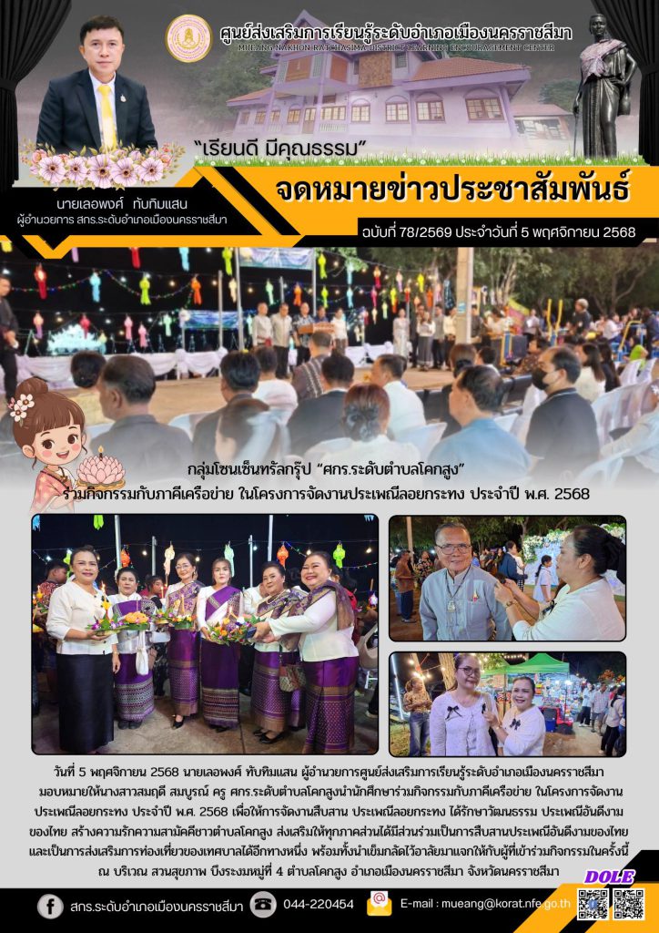 วันที่ 5 พฤศจิกายน 2568 นายเลอพงศ์ ทับทิมแสน ผู้อำนวยการศูนย์ส่งเสริมการเรียนรู้ระดับอำเภอเมืองนครราชสีมา มอบหมายให้นางสาวสมฤดี สมบูรณ์ ครู ศกร.ระดับตำบลโคกสูง นำนักศึกษาร่วมกิจกรรมกับภาคีเครือข่าย ในโครงการจัดงานประเพณีลอยกระทง ประจำปี พ.ศ. 2568 เพื่อให้การจัดงานสืบสานประเพณีลอยกระทง ได้รักษาวัฒนธรรม ประเพณีอันดีงามของไทย สร้างความรักความสามัคคีชาวตำบลโคกสูง ส่งเสริมให้ทุกภาคส่วนได้มีส่วนร่วมเป็นการสืบสานประเพณีอันดีงามของไทย และเป็นการส่งเสริมการท่องเที่ยวของเทศบาลได้อีกทางหนึ่ง พร้อมทั้งนำเข็มกลัดไว้อาลัยมาแจกให้กับผู้ที่เข้าร่วมกิจกรรมในครั้งนี้ ณ บริเวณ สวนสุขภาพ บึงระงม หมู่ที่ 4 ตำบลโคกสูง อำเภอเมืองนครราชสีมา จังหวัดนครราชสีมา