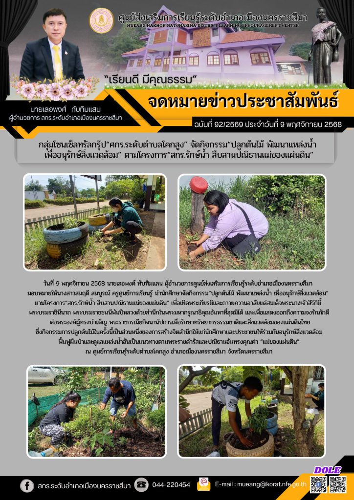 วันที่ 9 พฤศจิกายน 2568 นายเลอพงศ์ ทับทิมแสน ผู้อำนวยการศูนย์ส่งเสริมการเรียนรู้ระดับอำเภอเมืองนครราชสีมา มอบหมายให้นางสาวสมฤดี สมบูรณ์ ครูศูนย์การเรียนรู้ นำนักศึกษาจัดกิจกรรม“ปลูกต้นไม้ พัฒนาแหล่งน้ำ เพื่ออนุรักษ์สิ่งแวดล้อม” ตามโครงการ“สกร.รักษ์น้ำ สืบสานปณิธานแม่ของแผ่นดิน” เพื่อเทิดพระเกียรติและถวายความอาลัยแด่สมเด็จพระนางเจ้าสิริกิติ์ พระบรมราชินีนาถ พระบรมราชชนนีพันปีหลวงด้วยสำนึกในพระมหากรุณาธิคุณอันหาที่สุดมิได้ และเพื่อแสดงออกถึงความจงรักภักดี ต่อพระองค์ผู้ทรงบำเพ็ญ พระราชกรณียกิจนานัปการเพื่อรักษาทรัพยากรธรรมชาติและสิ่งแวดล้อมของแผ่นดินไทยซึ่งกิจกรรมการปลูกต้นไม้ในครั้งนี้เป็นส่วนหนึ่งของการสร้างจิตสำนึกให้แก่นักศึกษาและประชาชนให้ร่วมกันอนุรักษ์สิ่งแวดล้อม ฟื้นฟูผืนป่าและดูแลแหล่งน้ำอันเป็นแนวทางตามพระราชดำรัสและปณิธานอันทรงคุณค่า “แม่ของแผ่นดิน” ณ ศูนย์การเรียนรู้ระดับตำบลโคกสูง อำเภอเมืองนครราชสีมา จังหวัดนครราชสีมา