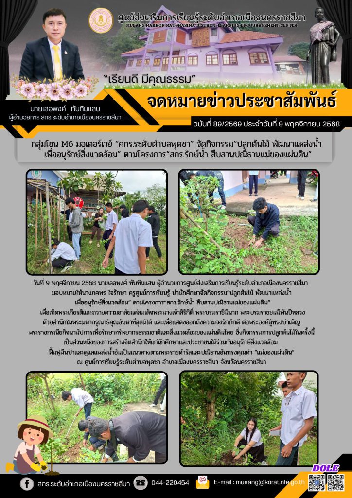 วันที่ 9 พฤศจิกายน 2568 นายเลอพงศ์ ทับทิมแสน ผู้อำนวยการศูนย์ส่งเสริมการเรียนรู้ระดับอำเภอเมืองนครราชสีมา มอบหมายให้นางภคพร ใจรักษา ครูศูนย์การเรียนรู้ นำนักศึกษาจัดกิจกรรม“ปลูกต้นไม้ พัฒนาแหล่งน้ำเพื่ออนุรักษ์สิ่งแวดล้อม” ตามโครงการ“สกร.รักษ์น้ำ สืบสานปณิธานแม่ของแผ่นดิน”เพื่อเทิดพระเกียรติและถวายความอาลัยแด่สมเด็จพระนางเจ้าสิริกิติ์ พระบรมราชินีนาถ พระบรมราชชนนีพันปีหลวงด้วยสำนึกในพระมหากรุณาธิคุณอันหาที่สุดมิได้ และเพื่อแสดงออกถึงความจงรักภักดี ต่อพระองค์ผู้ทรงบำเพ็ญพระราชกรณียกิจนานัปการเพื่อรักษาทรัพยากรธรรมชาติและสิ่งแวดล้อมของแผ่นดินไทย ซึ่งกิจกรรมการปลูกต้นไม้ในครั้งนี้เป็นส่วนหนึ่งของการสร้างจิตสำนึกให้แก่นักศึกษาและประชาชนให้ร่วมกันอนุรักษ์สิ่งแวดล้อม ฟื้นฟูผืนป่าและดูแลแหล่งน้ำอันเป็นแนวทางตามพระราชดำรัสและปณิธานอันทรงคุณค่า “แม่ของแผ่นดิน” ณ ศูนย์การเรียนรู้ระดับตำบลพุดซา อำเภอเมืองนครราชสีมา จังหวัดนครราชสีมา