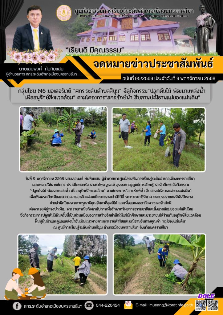 วันที่ 9 พฤศจิกายน 2568 นายเลอพงศ์ ทับทิมแสน ผู้อำนวยการศูนย์ส่งเสริมการเรียนรู้ระดับอำเภอเมืองนครราชสีมา มอบหมายให้นายชัดกร ปราณีตพลกรัง นางรภัทรญธรณ์ ลุนนอก ครูศูนย์การเรียนรู้ นำนักศึกษาจัดกิจกรรม “ปลูกต้นไม้ พัฒนาแหล่งน้ำ เพื่ออนุรักษ์สิ่งแวดล้อม” ตามโครงการ“สกร.รักษ์น้ำ สืบสานปณิธานแม่ของแผ่นดิน”เพื่อเทิดพระเกียรติและถวายความอาลัยแด่สมเด็จพระนางเจ้าสิริกิติ์ พระบรมราชินีนาถ พระบรมราชชนนีพันปีหลวง สำนึกในพระมหากรุณาธิคุณอันหาที่สุดมิได้ และเพื่อแสดงออกถึงความจงรักภักดีต่อพระองค์ผู้ทรงบำเพ็ญ พระราชกรณียกิจนานัปการเพื่อรักษาทรัพยากรธรรมชาติและสิ่งแวดล้อมของแผ่นดินไทยซึ่งกิจกรรมการปลูกต้นไม้ในครั้งนี้เป็นส่วนหนึ่งของการสร้างจิตสำนึกให้แก่นักศึกษาและประชาชนให้ร่วมกันอนุรักษ์สิ่งแวดล้อม ฟื้นฟูผืนป่าและดูแลแหล่งน้ำอันเป็นแนวทางตามพระราชดำรัสและปณิธานอันทรงคุณค่า “แม่ของแผ่นดิน” ณ ศูนย์การเรียนรู้ระดับตำบลสีมุม อำเภอเมืองนครราชสีมา จังหวัดนครราชสีมา