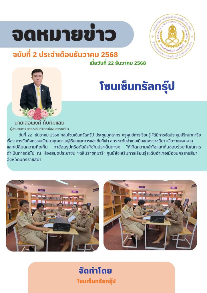 วันที่ 22 ธันวาคม 2568 กลุ่มโซนเซ็นทรัลกรุ๊ป ประชุมบุคลากร ครูศูนย์การเรียนรู้ ได้มีการจัดประชุมปรึกษาหารือ เรื่อง การจัดกิจกรรมพัฒนาคุณภาพผู้เรียนและการแข่งขันกีฬา สกร.ระดับอำเภอเมืองนครราชสีมา เพื่อวางแผนงาน แลกเปลี่ยนความคิดเห็น หาข้อสรุปหรือตัดสินใจในประเด็นต่างๆ ให้เกิดความเข้าใจและเห็นชอบร่วมกันในการดำเนินการต่อไป ณ ห้องสมุดประชาชน “เฉลิมราชกุมารี” ศูนย์ส่งเสริมการเรียนรู้ระดับอำเภอเมืองนครราชสีมา จังหวัดนครราชสีมา