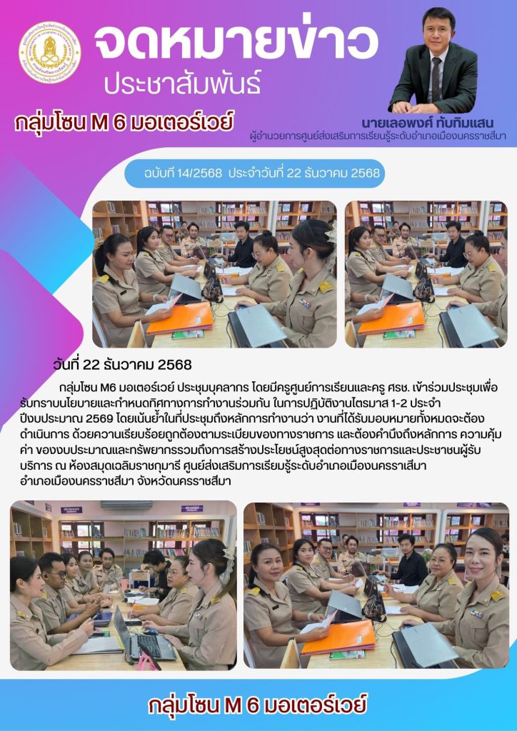วันที่ 22 ธันวาคม 2568 กลุ่มโซน M6 มอเตอร์เวย์ ประชุมบุคลากรโดยมีครูศูนย์การเรียนและครู ศรช. เข้าร่วมประชุมเพื่อรับทราบนโยบายและกำหนดทิศทางการทำงานร่วมกัน ในการปฏิบัติงานไตรมาส 1-2 ประจำปีงบประมาณ 2569 โดยเน้นย้ำในที่ประชุมถึงหลักการทำงานว่า งานที่ได้รับมอบหมายทั้งหมดจะต้องดำเนินการ ด้วยควานเรียบร้อยถูกต้องตามระเบียบของทางราชการ และต้องคำนึงถึงหลักการ ความคุ้มค่า ของงบประมาณและทรัพยากรรวมถึงการสร้างประโยชน์สูงสุดต่อทางราชการและประชาชนผู้รับบริการ ณ ห้องสมุดเฉลิมราชกุมารี ศูนย์ส่งเสริมการเรียมรู้ระดับอำเภอเมืองนครราชสีมา อำเภอเมืองนครราชสีมา จังหวัดนครราชสีมา
