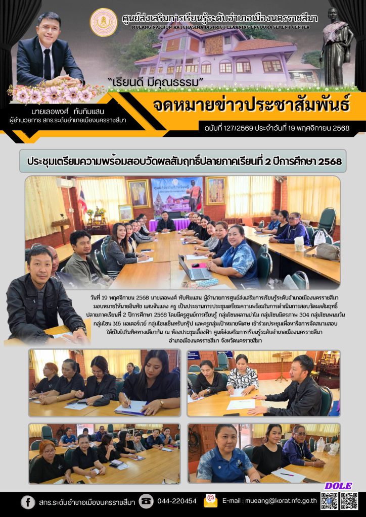 วันที่ 19 พฤศจิกายน 2568 นายเลอพงศ์ ทับทิมแสน ผู้อำนวยการศูนย์ส่งเสริมการเรียนรู้ระดับอำเภอเมืองนครราชสีมา มอบหมายให้นายอินทัช แสนจันแดง ครู เป็นประธานการประชุมเตรียมความพร้อมในการดำเนินการสอบวัดผลสัมฤทธิ์ปลายภาคเรียนที่ 2 ปีการศึกษา 2568 โดยมีครูศูนย์การเรียนรู้ กลุ่มโซนหลานย่าโม กลุ่มโซนมิตรภาพ 304 กลุ่มโซนพนมวัน กลุ่มโซน M6 มอเตอร์เวย์ กลุ่มโซนเซ็นทรับกรุ๊ป และครูกลุ่มเป้าหมายพิเศษ เข้าร่วมประชุมเพื่อหารือการจัดสนามสอบให้เป็นไปในทิศทางเดียวกัน ณ ห้องประชุมเอื้องฟ้า ศูนย์ส่งเสริมการเรียนรู้ระดับอำเภอเมืองนครราชสีมา อำเภอเมืองนครราชสีมา จังหวัดนครราชสีมา