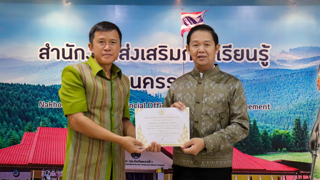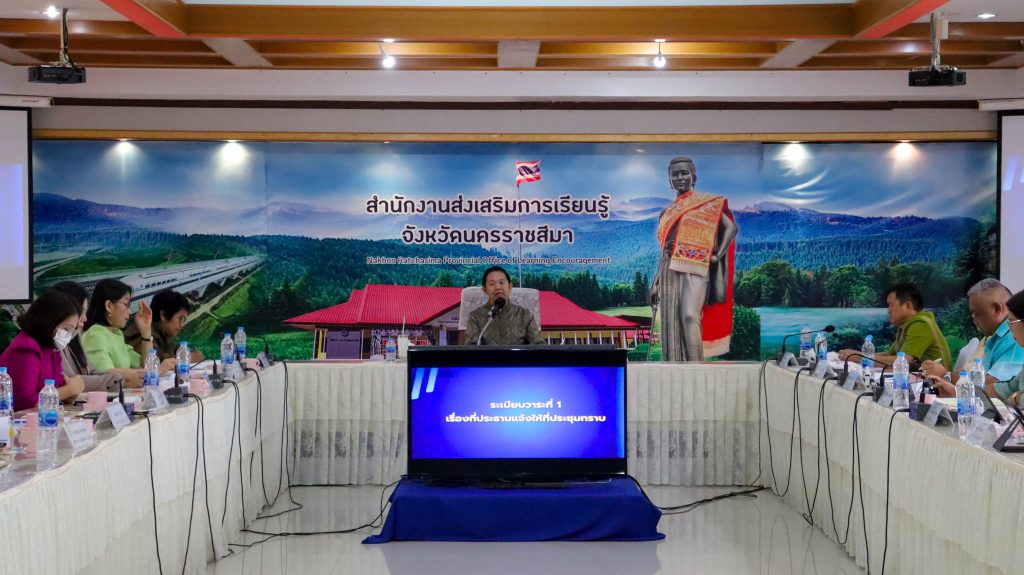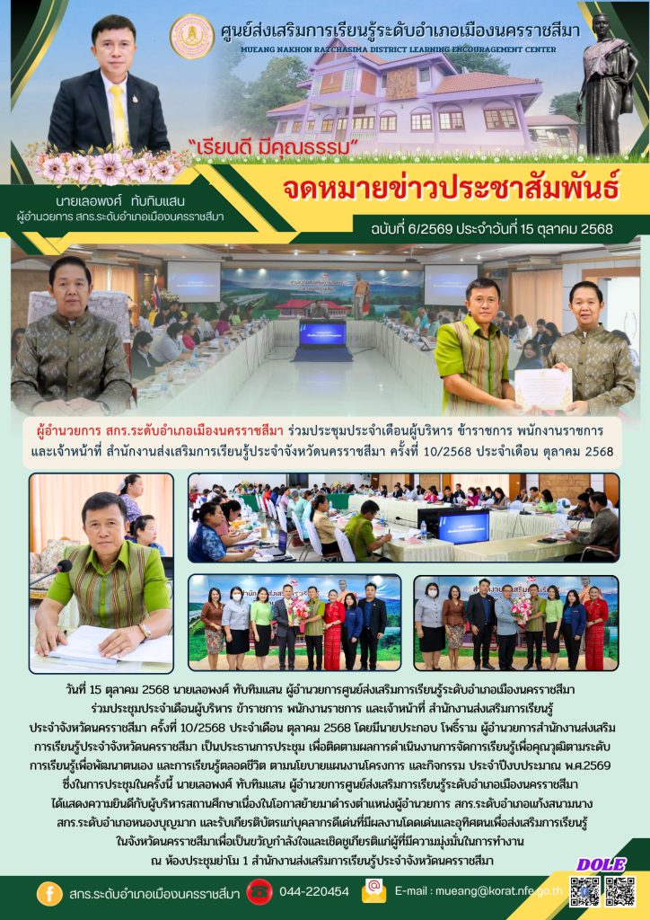 วันที่ 15 ตุลาคม 2568 นายเลอพงศ์ ทับทิมแสน ผู้อำนวยการศูนย์ส่งเสริมการเรียนรู้ระดับอำเภอเมืองนครราชสีมา ร่วมประชุมประจำเดือนผู้บริหาร ข้าราชการ พนักงานราชการ และเจ้าหน้าที่ สำนักงานส่งเสริมการเรียนรู้ประจำจังหวัดนครราชสีมา ครั้งที่ 10/2568 ประจำเดือน ตุลาคม 2568 โดยมีนายประกอบ โพธิ์ราม ผู้อำนวยการสำนักงานส่งเสริมการเรียนรู้ประจำจังหวัดนครราชสีมา เป็นประธานการประชุม เพื่อติดตามผลการดำเนินงานการจัดการเรียนรู้เพื่อคุณวุฒิตามระดับการเรียนรู้เพื่อพัฒนาตนเอง และการเรียนรู้ตลอดชีวิต ตามนโยบายแผนงานโครงการ และกิจกรรม ประจำปีงบประมาณ พ.ศ.2569 ซึ่งในการประชุมในครั้งนี้ นายเลอพงศ์ ทับทิมแสน ผู้อำนวยการศูนย์ส่งเสริมการเรียนรู้ระดับอำเภอเมืองนครราชสีมา ได้แสดงความยินดีกับผู้บริหารสถานศึกษาเนื่องในโอกาสย้ายมาดำรงตำแหน่งผู้อำนวยการ สกร.ระดับอำเภอแก้งสนามนาง สกร.ระดับอำเภอหนองบุญมาก และรับเกียรติบัตรแก่บุคลากรดีเด่นที่มีผลงานโดดเด่นและอุทิศตนเพื่อส่งเสริมการเรียนรู้ ในจังหวัดนครราชสีมาเพื่อเป็นขวัญกำลังใจและเชิดชูเกียรติแก่ผู้ที่มีความมุ่งมั่นในการทำงาน ณ ห้องประชุมย่าโม 1 สำนักงานส่งเสริมการเรียนรู้ประจำจังหวัดนครราชสีมา