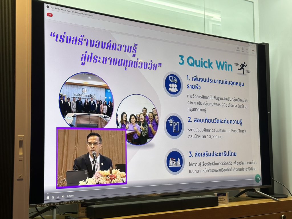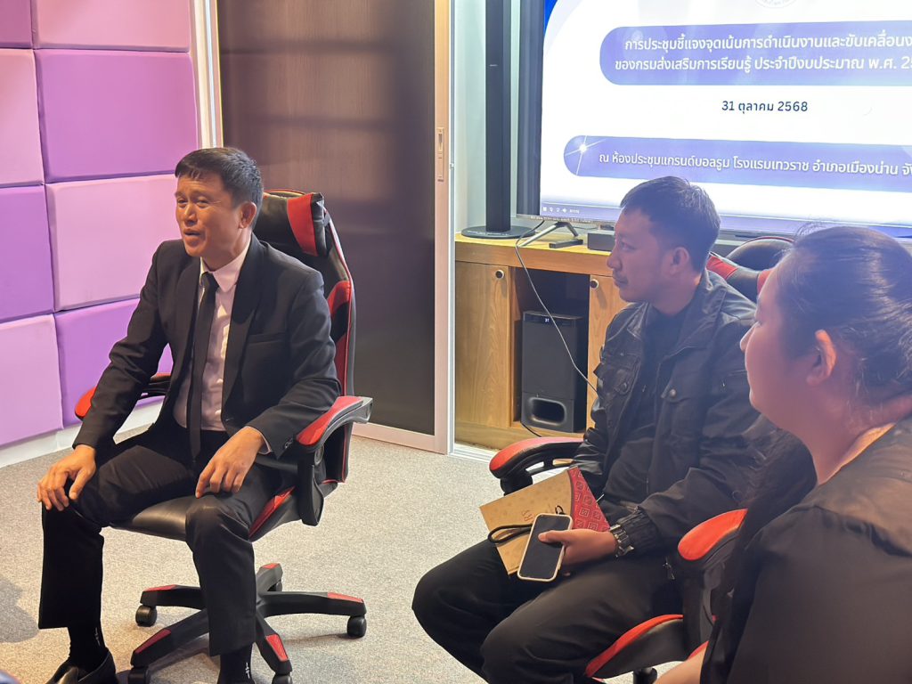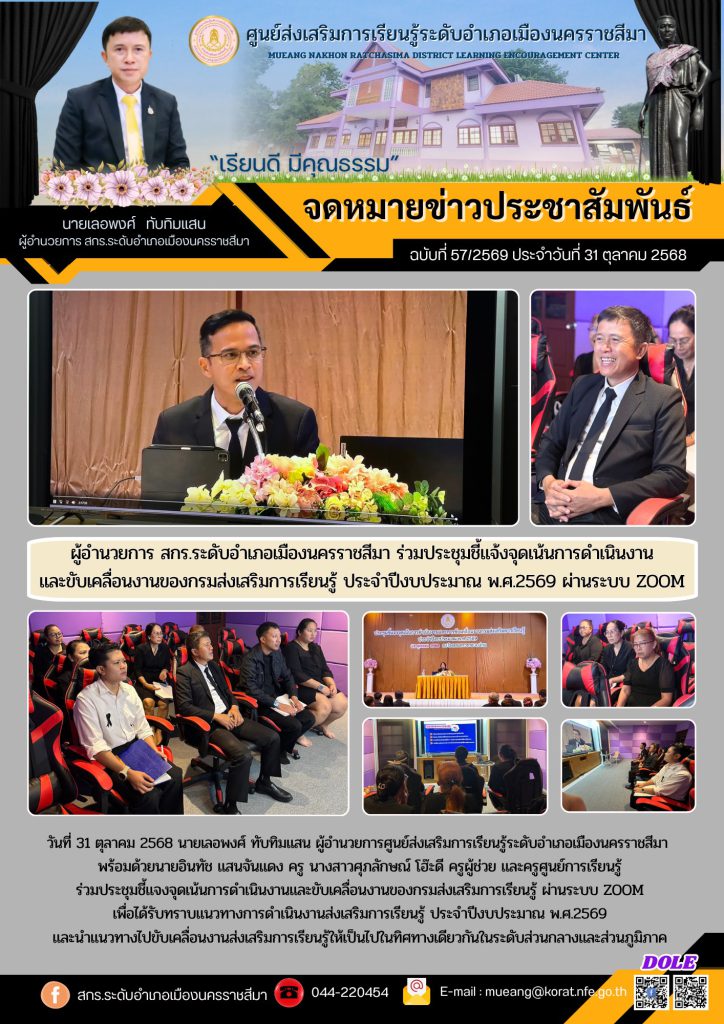 วันที่ 31 ตุลาคม 2568 นายเลอพงศ์ ทับทิมแสน ผู้อำนวยการศูนย์ส่งเสริมการเรียนรู้ระดับอำเภอเมืองนครราชสีมา พร้อมด้วยนายอินทัช แสนจันแดง ครู นางสาวศุภลักษณ์ โฮ๊ะดี ครูผู้ช่วย และครูศูนย์การเรียนรู้ร่วมประชุมชี้แจงจุดเน้นการดำเนินงานและขับเคลื่อนงานของกรมส่งเสริมการเรียนรู้ ผ่านระบบ Zoom เพื่อได้รับทราบแนวทางการดำเนินงานส่งเสริมการเรียนรู้ ประจำปีงบประมาณ พ.ศ.2569 และนำแนวทางไปขับเคลื่อนงานส่งเสริมการเรียนรู้ให้เป็นไปในทิศทางเดียวกันในระดับส่วนกลางและส่วนภูมิภาค