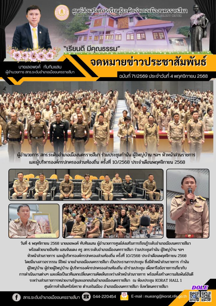 วันที่ 4 พฤศจิกายน 2568 นายเลอพงศ์ ทับทิมแสน ผู้อำนวยการศูนย์ส่งเสริมการเรียนรู้ระดับอำเภอเมืองนครราชสีมา พร้อมด้วยนายอินทัช แสนจันแดง ครู สกร.ระดับอำเภอเมืองนครราชสีมา ร่วมประชุมกำนัน ผู้ใหญ่บ้าน ฯลฯ หัวหน้าส่วนราชการ และผู้บริหารองค์กรปกครองส่วนท้องถิ่น ครั้งที่ 10/2568 ประจำเดือนพฤศจิกายน 2568 โดยมีนางสาวอรวรรณ มีใหม่ นายอำเภอเมืองนครราชสีมา เป็นประธานการประชุม ซึ่งมีหัวหน้าส่วนราชการ กำนันผู้ใหญ่บ้าน ผู้ช่วยผู้ใหญ่บ้าน ผู้บริหารองค์กรปกครองส่วนท้องถิ่น เข้าร่วมประชุม เพื่อหารือข้อราชการเกี่ยวกับการดำเนินงานต่างๆ และเพื่อเป็นเวทีแลกเปลี่ยนความคิดเห็นระหว่างหัวหน้าส่วนราชการ พร้อมทั้งสร้างความสัมพันธ์อันดีระหว่างส่วนราชการหน่วยงานรัฐและเอกชนในอำเภอเมืองนครราชสีมา ณ ห้องประชุม korat Hall 1 ศูนย์การค้าเช็นทรัลโคราช ตำบลในเมือง อำเภอเมืองนครราชสีมา จังหวัดนครราชสีมา