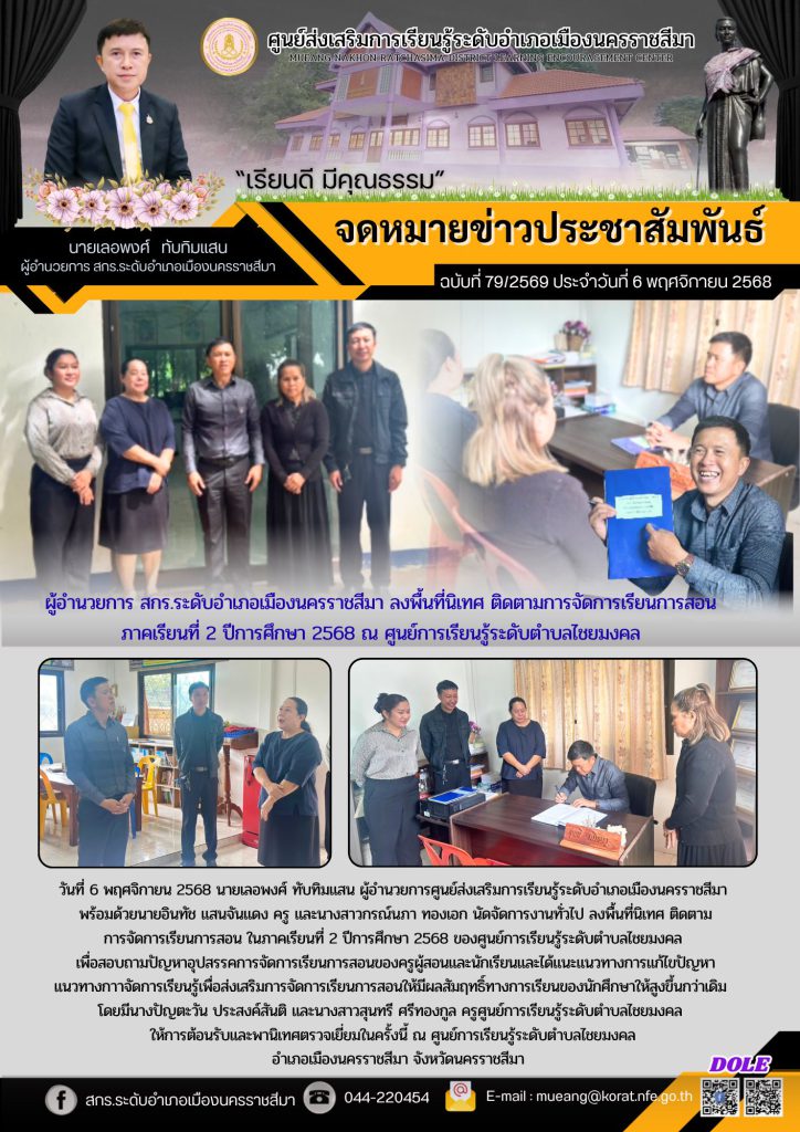 วันที่ 6 พฤศจิกายน 2568 นายเลอพงศ์ ทับทิมแสน ผู้อำนวยการศูนย์ส่งเสริมการเรียนรู้ระดับอำเภอเมืองนครราชสีมาพร้อมด้วยนายอินทัช แสนจันแดง ครู และนางสาวกรณ์นภา ทองเอก นัดจัดการงานทั่วไป ลงพื้นที่นิเทศ ติดตามการจัดการเรียนการสอน ในภาคเรียนที่ 2 ปีการศึกษา 2568 ของศูนย์การเรียนรู้ระดับตำบลไชยมงคลเพื่อสอบถามปัญหาอุปสรรคการจัดการเรียนการสอนของครูผู้สอนและนักเรียนและได้แนะแนวทางการแก้ไขปัญหา แนวทางกาาจัดการเรียนรู้เพื่อส่งเสริมการจัดการเรียนการสอนให้มีผลสัมฤทธิ์ทางการเรียนของนักศึกษาให้สูงขึ้นกว่าเดิม โดยมีนางปัญตะวัน ประสงค์สันติ และนางสาวสุนทรี ศรีทองกูล ครูศูนย์การเรียนรู้ระดับตำบลไชยมงคล ให้การต้อนรับและพานิเทศตรวจเยี่ยมในครั้งนี้ ณ ศูนย์การเรียนรู้ระดับตำบลไชยมงคล อำเภอเมืองนครราชสีมา จังหวัดนครราชสีมา