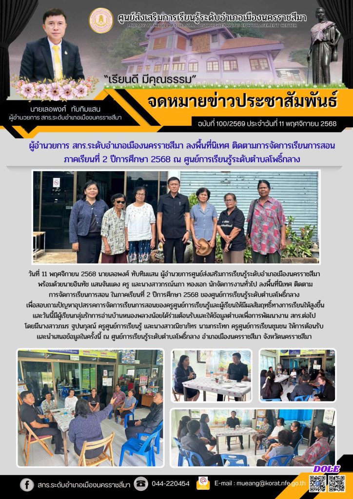 วันที่ 11 พฤศจิกายน 2568 นายเลอพงศ์ ทับทิมแสน ผู้อำนวยการศูนย์ส่งเสริมการเรียนรู้ระดับอำเภอเมืองนครราชสีมาพร้อมด้วยนายอินทัช แสนจันแดง ครู และนางสาวกรณ์นภา ทองเอก นักจัดการงานทั่วไป ลงพื้นที่นิเทศ ติดตามการจัดการเรียนการสอน ในภาคเรียนที่ 2 ปีการศึกษา 2568 ของศูนย์การเรียนรู้ระดับตำบลโพธิ์กลาง เพื่อสอบถามปัญหาอุปสรรคการจัดการเรียนการสอนของครูศูนย์การเรียนรู้และผู้เรียนให้มีผลสัมฤทธิ์ทางการเรียนให้สูงขึ้น และวันนี้มีผู้เรียนกลุ่มรักการอ่านบ้านหนองพลวงน้อยได้ร่วมต้อนรับและให้ข้อมูลตำบลเพื่อการพัฒนางาน สกร.ต่อไปโดยมีนางสาวภมร ฐปนกุลณ์ ครูศูนย์การเรียนรู้ และนางสาวณิชาภัทร นามกระโทก ครูศูนย์การเรียนชุมชน ให้การต้อนรับและนำเสนอข้อมูลในครั้งนี้ ณ ศูนย์การเรียนรู้ระดับตำบลโพธิ์กลาง อำเภอเมืองนครราชสีมา จังหวัดนครราชสีมา