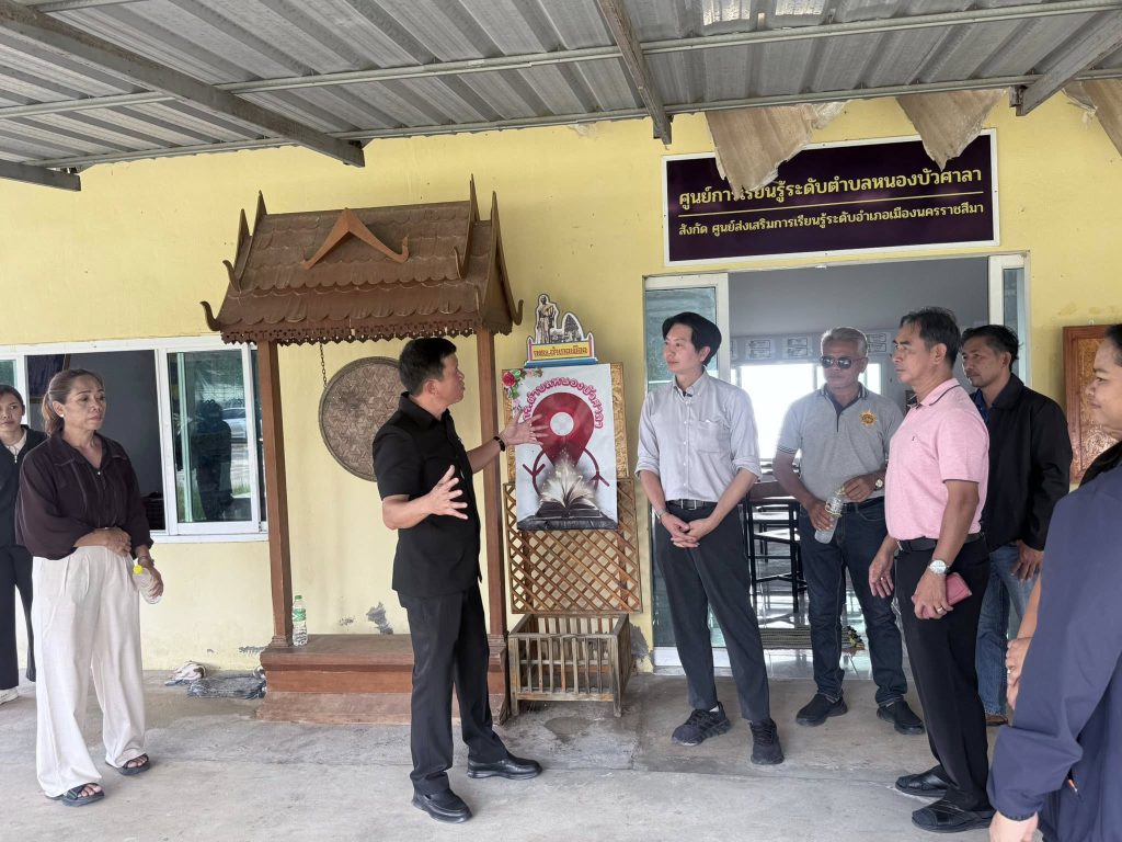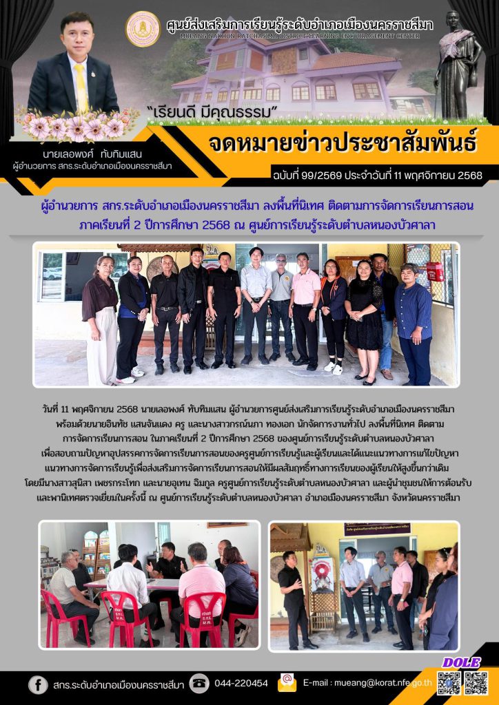 วันที่ 11 พฤศจิกายน 2568 นายเลอพงศ์ ทับทิมแสน ผู้อำนวยการศูนย์ส่งเสริมการเรียนรู้ระดับอำเภอเมืองนครราชสีมาพร้อมด้วยนายอินทัช แสนจันแดง ครู และนางสาวกรณ์นภา ทองเอก นักจัดการงานทั่วไป ลงพื้นที่นิเทศ ติดตามการจัดการเรียนการสอน ในภาคเรียนที่ 2 ปีการศึกษา 2568 ของศูนย์การเรียนรู้ระดับตำบลหนองบัวศาลาเพื่อสอบถามปัญหาอุปสรรคการจัดการเรียนการสอนของครูศูนย์การเรียนรู้และผู้เรียนและได้แนะแนวทางการแก้ไขปัญหาแนวทางการจัดการเรียนรู้เพื่อส่งเสริมการจัดการเรียนการสอนให้มีผลสัมฤทธิ์ทางการเรียนของผู้เรียนให้สูงขึ้นกว่าเดิม โดยมีนางสาวสุนิสา เพชรกระโทก และนายอุเทน ฉิมกูล ครูศูนย์การเรียนรู้ระดับตำบลหนองบัวศาลา และผู้นำชุมชนให้การต้อนรับและพานิเทศตรวจเยี่ยมในครั้งนี้ ณ ศูนย์การเรียนรู้ระดับตำบลหนองบัวศาลา อำเภอเมืองนครราชสีมา จังหวัดนครราชสีมา