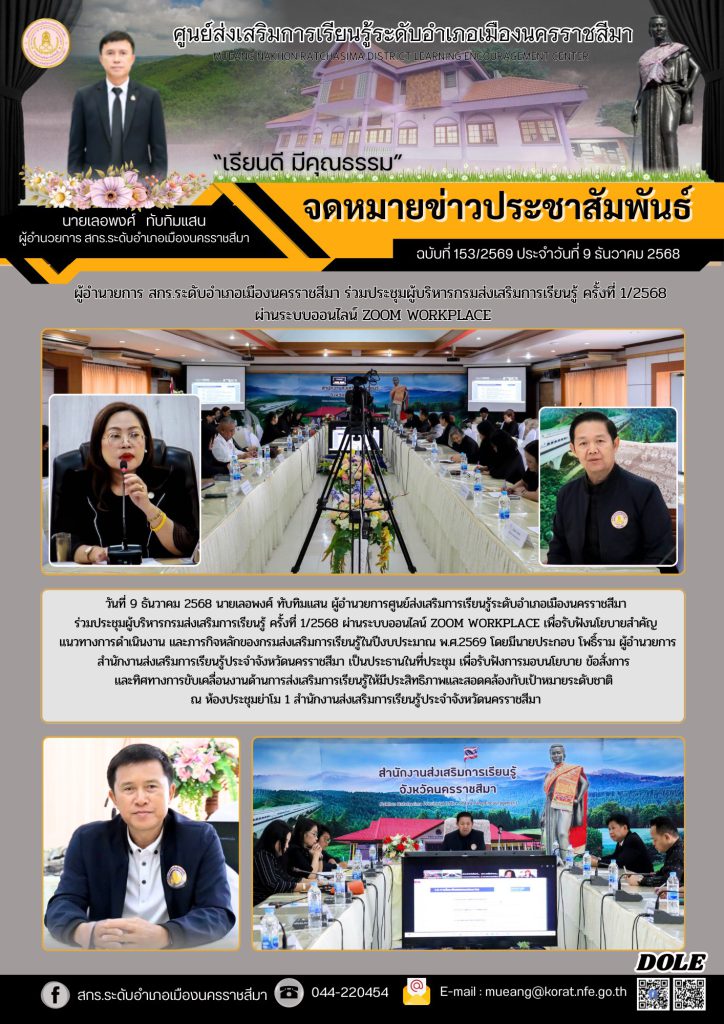 วันที่ 9 ธันวาคม 2568 นายเลอพงศ์ ทับทิมแสน ผู้อำนวยการศูนย์ส่งเสริมการเรียนรู้ระดับอำเภอเมืองนครราชสีมา ร่วมประชุมผู้บริหารกรมส่งเสริมการเรียนรู้ ครั้งที่ 1/2568 ผ่านระบบออนไลน์ Zoom Workplace เพื่อรับฟังนโยบายสำคัญ แนวทางการดำเนินงาน และภารกิจหลักของกรมส่งเสริมการเรียนรู้ในปีงบประมาณ พ.ศ.2569 โดยมีนายประกอบ โพธิ์ราม ผู้อำนวยการสำนักงานส่งเสริมการเรียนรู้ประจำจังหวัดนครราชสีมา เป็นประธานในที่ประชุม เพื่อรับฟังการมอบนโยบาย ข้อสั่งการและทิศทางการขับเคลื่อนงานด้านการส่งเสริมการเรียนรู้ให้มีประสิทธิภาพและสอดคล้องกับเป้าหมายระดับชาติณ ห้องประชุมย่าโม 1 สำนักงานส่งเสริมการเรียนรู้ประจำจังหวัดนครราชสีมา