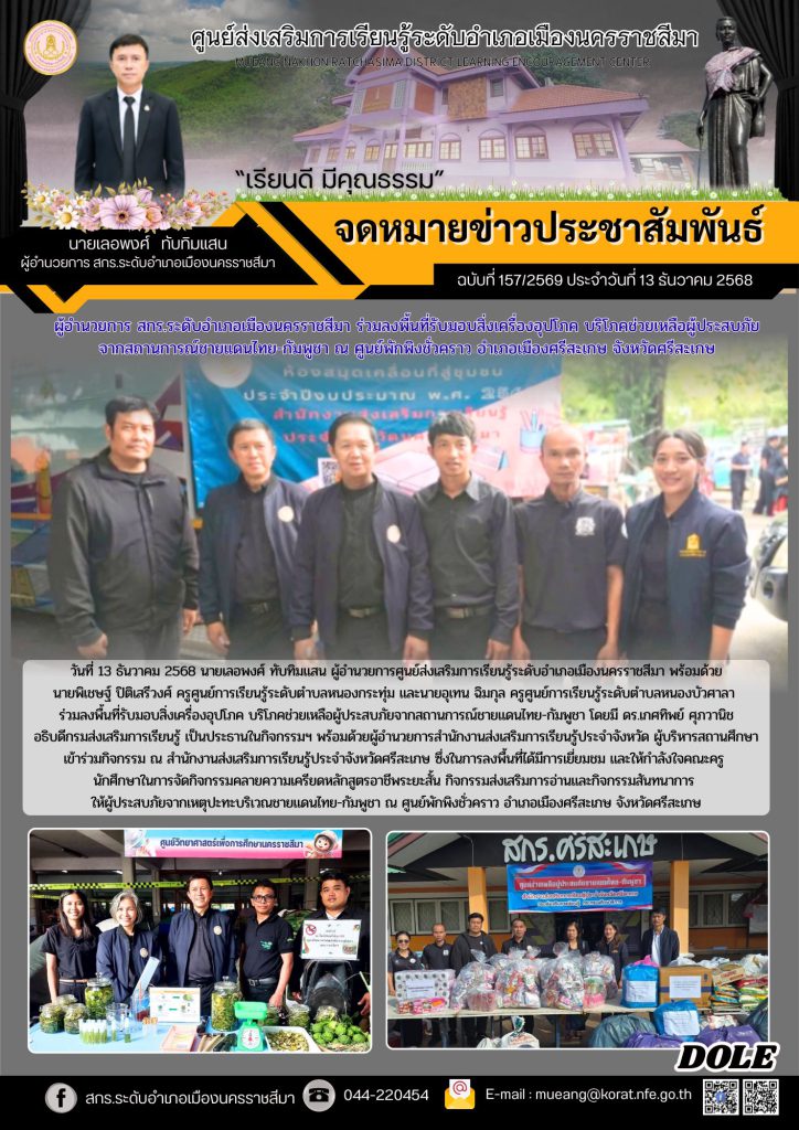 วันที่ 13 ธันวาคม 2568 นายเลอพงศ์ ทับทิมแสน ผู้อำนวยการศูนย์ส่งเสริมการเรียนรู้ระดับอำเภอเมืองนครราชสีมา พร้อมด้วย นายพิเชษฐ์ ปิติเสรีวงศ์ ครูศูนย์การเรียนรู้ระดับตำบลหนองกระทุ่ม และนายอุเทน ฉิมกุล ครูศูนย์การเรียนรู้ระดับตำบลหนองบัวศาลา ร่วมลงพื้นที่รับมอบสิ่งเครื่องอุปโภค​ บริโภค​ช่วยเหลือ​ผู้ประสบภัยจากสถานการณ์​ชายแดนไทย-กัมพูชา​ โดยมี ดร.เกศทิพย์ ศุภวานิช อธิบดีกรมส่งเสริม​ ​ประธานในกิจกรรม​ฯ​ พร้อมด้วยผู้อำนวยการ​สำนักงาน​ส่ง​เสริม​การ​เรียนรู้​ประจำ​จังหวัด​ ผู้บริหาร​สถานศึกษา​ เข้าร่วมกิจก​รร​ม​ ณ​ สำนักงาน​ส่งเสริม​การเรียนรู้​ประจำจังหวัดศรีสะเกษ ซึ่งในการลงพื้นที่ได้มีการเยี่ยม​ชม​ และ​ให้กำลังใจคณะครูนักศึกษา​​ในการจัดกิจกรรมคลายความเครียดหลักสูตรอาชีพระยะสั้น​ กิจกรรม​ส่งเสริมการอ่าน​และกิจกรรมสันทนาการ​ให้ผู้ประสบภัยจากเหตุปะทะบริเวณชายแดนไทย-กัมพูชา ณ ศูนย์พักพิงชั่วคราว อำเภอเมืองศรีสะเกษ จังหวัดศรีสะเกษ