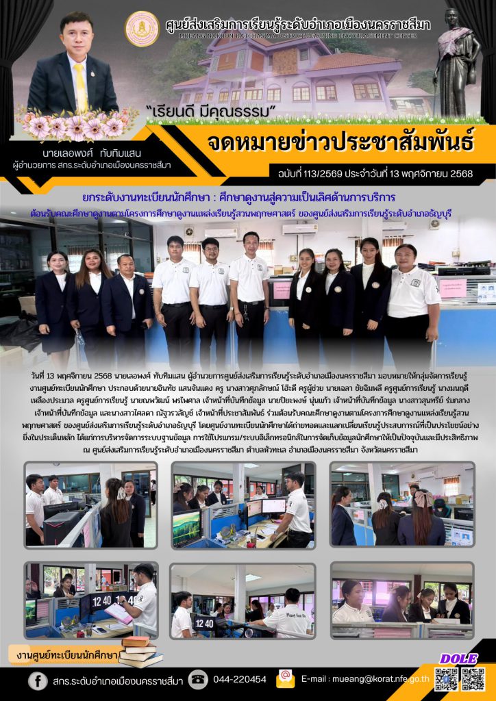 วันที่ 13 พฤศจิกายน 2568 นายเลอพงศ์ ทับทิมแสน ผู้อำนวยการศูนย์ส่งเสริมการเรียนรู้ระดับอำเภอเมืองนครราชสีมา มอบหมายให้กลุ่มจัดการเรียนรู้ งานศูนย์ทะเบียนนักศึกษา ประกอบด้วยนายอินทัช แสนจันแดง ครู นางสาวศุภลักษณ์ โฮ๊ะดี ครูผู้ช่วย นายเฉลา ชัยฉิมพลี ครูศูนย์การเรียนรู้ นางมนฤดี เหลืองประมวล ครูศูนย์การเรียนรู้ นายณพวัฒน์ พรไพศาล เจ้าหน้าที่บันทึกข้อมูล นายปิยะพงษ์ นุ่นแก้ว เจ้าหน้าที่บันทึกข้อมูล นางสาวสุนทรีย์ ร่มกลาง เจ้าหน้าที่บันทึกข้อมูล และนางสาวไศลดา ณัฐวรวลัญช์ เจ้าหน้าที่ประชาสัมพันธ์ ร่วมต้อนรับคณะศึกษาดูงานตามโครงการศึกษาดูงานแหล่งเรียนรู้สวนพฤกษศาสตร์ ของศูนย์ส่งเสริมการเรียนรู้ระดับอำเภอธัญบุรี โดยศูนย์งานทะเบียนนักศึกษาได้ถ่ายทอดและแลกเปลี่ยนเรียนรู้ประสบการณ์ที่เป็นประโยชน์อย่างยิ่งในประเด็นหลัก ได้แก่การบริหารจัดการระบบฐานข้อมูล การใช้โปรแกรม/ระบบอิเล็กทรอนิกส์ในการจัดเก็บข้อมูลนักศึกษาให้เป็นปัจจุบันและมีประสิทธิภาพ ณ ศูนย์ส่งเสริมการเรียนรู้ระดับอำเภอเมืองนครราชสีมา ตำบลหัวทะเล อำเภอเมืองนครราชสีมา จังหวัดนครราชสีมา