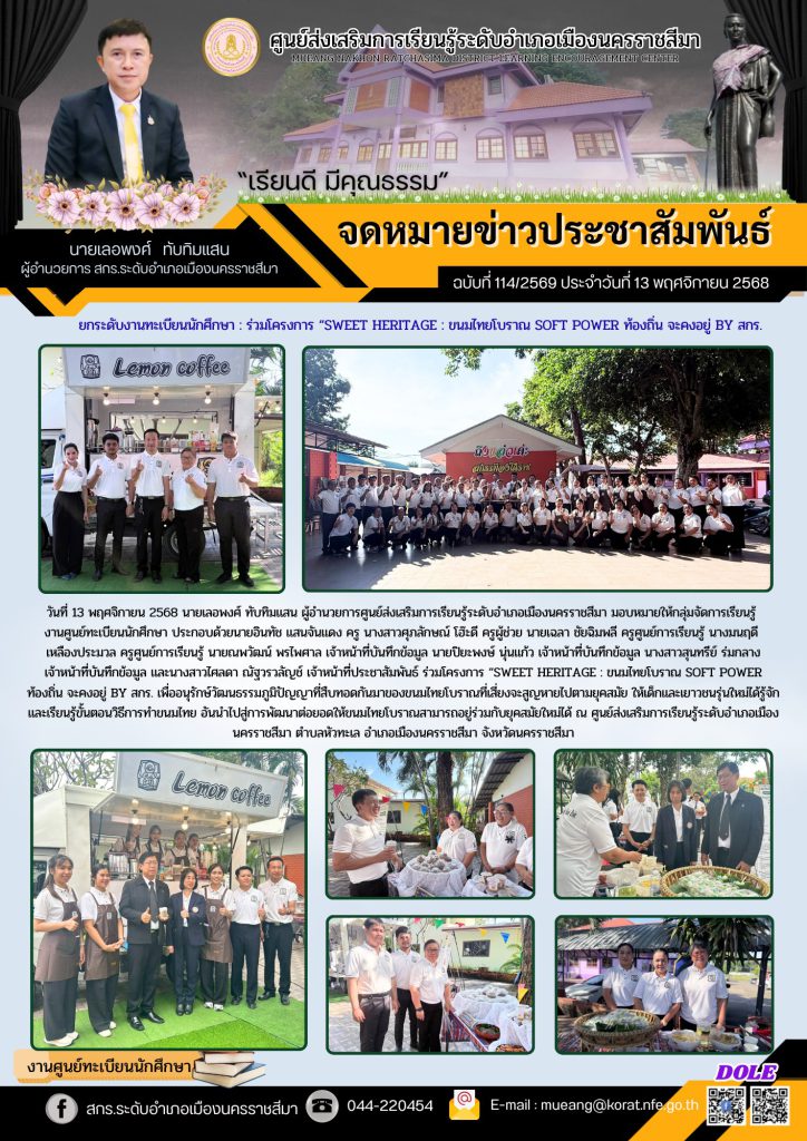 วันที่ 13 พฤศจิกายน 2568 นายเลอพงศ์ ทับทิมแสน ผู้อำนวยการศูนย์ส่งเสริมการเรียนรู้ระดับอำเภอเมืองนครราชสีมา มอบหมายให้กลุ่มจัดการเรียนรู้ งานศูนย์ทะเบียนนักศึกษา ประกอบด้วยนายอินทัช แสนจันแดง ครู นางสาวศุภลักษณ์ โฮ๊ะดี ครูผู้ช่วย นายเฉลา ชัยฉิมพลี ครูศูนย์การเรียนรู้ นางมนฤดี เหลืองประมวล ครูศูนย์การเรียนรู้ นายณพวัฒน์ พรไพศาล เจ้าหน้าที่บันทึกข้อมูล นายปิยะพงษ์ นุ่นแก้ว เจ้าหน้าที่บันทึกข้อมูล นางสาวสุนทรีย์ ร่มกลาง เจ้าหน้าที่บันทึกข้อมูล และนางสาวไศลดา ณัฐวรวลัญช์ เจ้าหน้าที่ประชาสัมพันธ์ ร่วมโครงการ “Sweet Heritage : ขนมไทยโบราณ soft power ท้องถิ่น จะคงอยู่ by สกร. เพื่ออนุรักษ์วัฒนธรรมภูมิปัญญาที่สืบทอดกันมาของขนมไทยโบราณที่เสี่ยงจะสูญหายไปตามยุคสมัย ให้เด็กและเยาวชนรุ่นใหม่ได้รู้จักและเรียนรู้ขั้นตอนวิธีการทำขนมไทย อันนำไปสู่การพัฒนาต่อยอดให้ขนมไทยโบราณสามารถอยู่ร่วมกับยุคสมัยใหม่ได้ ณ ศูนย์ส่งเสริมการเรียนรู้ระดับอำเภอเมืองนครราชสีมา ตำบลหัวทะเล อำเภอเมืองนครราชสีมา จังหวัดนครราชสีมา