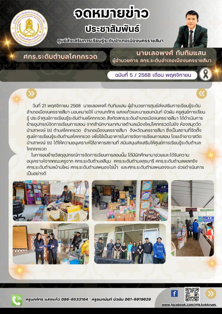 วันที่ 21 พฤศจิกายน 2568 นายเลอพงศ์ ทับทิมแสน ผู้อำนวยการศูนย์ส่งเสริมการเรียนรู้ระดับอำเภอเมืองนครราชสีมา มอบหมายให้ นางนภภัทร แสงแก้วและนายชนกนันท์ บัวผัน ครูศูนย์การเรียนรู้ ประจำศูนย์การเรียนรู้ระดับตำบลโคกกรวด สังกัดสกร.ระดับอำเภอเมืองนครราชสีมา ได้ดำเนินการย้ายอุปกรณ์จัดการเรียนการสอน จากสำนักงานเทศบาลตำบลเมืองใหม่โคกกรวดไปยัง ห้องสมุดวัดป่าเสาหงษ์ (ธ) ตำบลโคกกรวด อำเภอเมืองนครราชสีมา จังหวัดนครราชสีมา ซึ่งเป็นสถานที่จัดตั้ง ศูนย์การเรียนรู้ระดับตำบลโคกกรวด เพื่อใช้เป็นอาคารในการจัดการเรียนการสอน โดยเจ้าอาวาสวัดป่าเสาหงษ์ (ธ) ได้ให้ความอนุเคราะห์ใช้อาคารสถานที่ สนับสนุนส่งเสริมให้ศูนย์การเรียนรู้ระดับตำบลโคกกกรวด ในการขนย้ายวัสดุอุปกรณ์การจัดการเรียนการสอนนั้น ได้มีนักศีกษามาช่วยและได้รับความอนุเคราะห์คณะครูจาก ศกร.ระดับตำบลสีมุม ศกร.ระดับตำบลสุรนารี ศกร.ระดับตำบลพลกรัง ศกร.ระดับตำบลบ้านใหม่ ศกร.ระดับตำบลหนองไข่น้ำ และศกร.ระดับตำบลหนองจะบก ช่วยดำเนินการเป็นอย่างดี