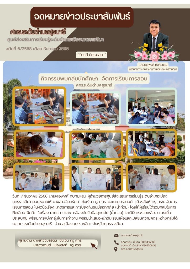 วันที่ 7 ธันวาคม 2568 นายเลอพงศ์ ทับทิมแสน ผู้อำนวยการศูนย์ส่งเสริมการเรียนรู้ระดับอำเภอเมืองนครราชสีมา มอบหมายให้ นางสาววิมลรัตน์ ขันเงิน ครู ศกร. และนายวรกานต์ เมืองสิงห์ ครู ศรช. จัดการเรียนการสอน ในหัวข้อเรื่อง มาตรการและการป้องกันรับมืออุทกภัย (น้ำท่วม) โดยให้ผู้เรียนได้รวมกลุ่มในการฝึกเขียน ฝึกคิด ในเรื่อง มาตรการและการป้องกันรับมืออุทกภัย (น้ำท่วม) และวิธีการช่วยเหลือตนเองเมื่อประสบภัย พร้อมการแบ่งกลุ่มในการทำงาน พร้อมนำเสนอหน้าชั้นเรียนเผื่อแลกเปลี่ยนความคิดระหว่างกลุ่มได้ ณ ศกร.ระดับตำบลสุรนารี อำเภอเมืองนครราชสีมา จังหวัดนครราชสีมา