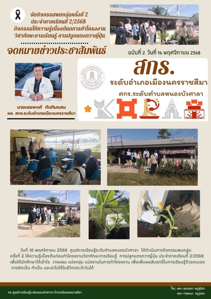วันที่ 16 พฤศจิกายน 2568 ศูนย์การเรียนรู้ระดับตำบลหนองบัวศาลา ได้ดำเนินการกิจกรรมพบกลุ่มครั้งที่ 2 ให้ความรู้เบื้องต้นก่อนทำโครงงานวิชาทักษะการเรียนรู้ การปลูกแตงกวาญี่ปุ่น ประจำภาคเรียนที่ 2/2568 เพื่อให้นักศึกษาได้เข้าใจ วางแผน แบ่งกลุ่ม แบ่งงานในการทำโครงงาน เพื่อเพื่มผลสัมฤทธิ์ในการเรียนรู้ด้วยตนเอง การคิดเป็น ทำเป็น และนำไปใช้ในชีวิตประจำวันได้
