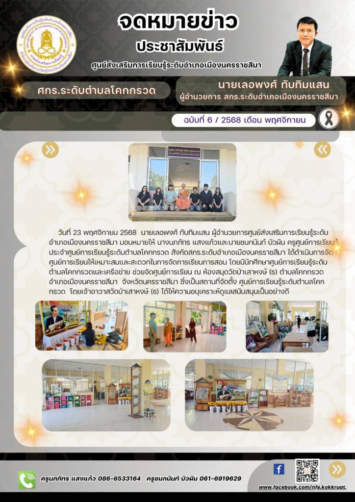 วันที่ 23 พฤศจิกายน 2568 นายเลอพงศ์ ทับทิมแสน ผู้อำนวยการศูนย์ส่งเสริมการเรียนรู้ระดับอำเภอเมืองนครราชสีมา มอบหมายให้ นางนภภัทร แสงแก้วและนายชนกนันท์ บัวผัน ครูศูนย์การเรียนรู้ ประจำศูนย์การเรียนรู้ระดับตำบลโคกกรวด สังกัดสกร.ระดับอำเภอเมืองนครราชสีมา ได้ดำเนินการจัดศูนย์การเรียนให้เหมาะสมและสะดวกในการจัดการเรียนการสอน โดยมีนักศึกษาศูนย์การเรียนรู้ระดับตำบลโคกกรวดและเครือข่าย ช่วยจัดศูนย์การเรียน ณ ห้องสมุดวัดป่าเสาหงษ์ (ธ) ตำบลโคกกรวด อำเภอเมืองนครราชสีมา จังหวัดนครราชสีมา ซึ่งเป็นสถานที่จัดตั้ง ศูนย์การเรียนรู้ระดับตำบลโคกกรวด โดยเจ้าอาวาสวัดป่าเสาหงษ์ (ธ) ได้ให้ความอนุเคราะห์ดูแลสนับสนุนเป็นอย่างดี