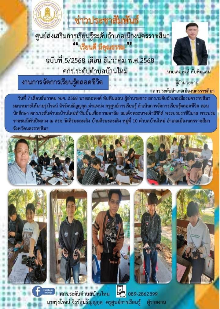 วันที่ 7 เดือนธันวาคม พ.ศ. 2568 นายเลอพงศ์ ทับทิมแสน ผู้อำนวยการ สกร.ระดับอำเภอเมืองนครราชสีมา มอบหมายให้นายรุ่งโรจน์ จิรรัตนธัญญกุล ตำแหน่ง ครูศูนย์การเรียนรู้ ดำเนินการจัดการเรียนรู้ตลอดชีวิต สอนนักศึกษา ศกร.ระดับตำบลบ้านใหม่ทำริบบิ้นเพื่อถวายอาลัย สมเด็จพระนางเจ้าสิริกิต์ พระบรมราชีนีนาถ พระบรมราชชนนีพันปีหลวง ณ ศรช.วัดศีรษะละเลิง บ้านศีรษะละเลิง หมู่ที่ 10 ตำบลบ้านใหม่ อำเภอเมืองนครราชสีมา จังหวัดนครราชสีมา