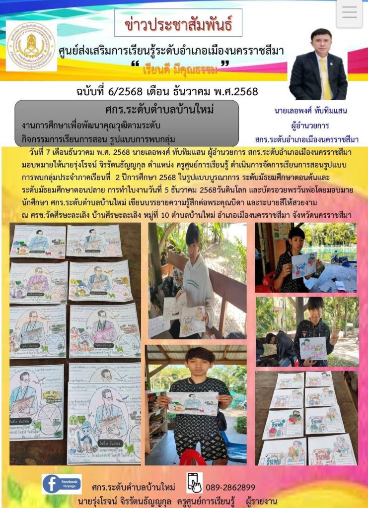 วันที่ 7 เดือนธันวาคม พ.ศ. 2568 นายเลอพงศ์ ทับทิมแสน ผู้อำนวยการ สกร.ระดับอำเภอเมืองนครราชสีมามอบหมายให้นายรุ่งโรจน์ จิรรัตนธัญญกุล ตำแหน่ง ครูศูนย์การเรียนรู้ ดำเนินการจัดการเรียนการสอนรูปแบบการพบกลุ่มประจำภาคเรียนที่ 2 ปีการศึกษา 2568 ในรูปแบบบูรณาการ ระดับมัธยมศึกษาตอนต้นและระดับมัธยมศึกษาตอนปลาย การทำใบงานวันที่ 5 ธันวาคม 2568วันดินโลก และบัตรอวยพรวันพ่อโดยมอบมายนักศึกษา ศกร.ระดับตำบลบ้านใหม่ เขียนบรรยายความรู้สึกต่อพระคุณบิดา และระบายสีให้สวยงาม ณ ศรช.วัดศีรษะละเลิง บ้านศีรษะละเลิง หมู่ที่ 10 ตำบลบ้านใหม่ อำเภอเมืองนครราชสีมา จังหวัดนครราชสีมา