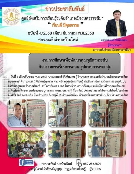 วันที่ 7 เดือนธันวาคม พ.ศ. 2568 นายเลอพงศ์ ทับทิมแสน ผู้อำนวยการ สกร.ระดับอำเภอเมืองนครราชสีมา มอบหมายให้นายรุ่งโรจน์ จิรรัตนธัญญกุล ตำแหน่ง ครูศูนย์การเรียนรู้ ดำเนินการจัดการเรียนการสอนรูปแบบการพบกลุ่มประจำภาคเรียนที่ 2 ปีการศึกษา 2568 ในรายงิชา ภาษาอังกฤษ ระดับมัธยมศึกษาตอนต้นและ ระดับมัธยมศึกษาตอนปลายแบบบูรณาการ ทบทวนความรู้ เรื่อง สัตว์ Animal และทำใบงานส่งในชั่วโมงเรียน ณ ศรช.วัดศีรษะละเลิง บ้านศีรษะละเลิง หมู่ที่ 10 ตำบลบ้านใหม่ อำเภอเมืองนครราชสีมา จังหวัดนครราชสีมา