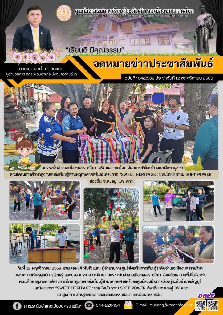 วันที่ 12 พฤศจิกายน 2568 นายเลอพงศ์ ทับทิมแสน ผู้อำนวยการศูนย์ส่งเสริมการเรียนรู้ระดับอำเภอเมืองนครราชสีมา มอบหมายให้ครูศูนย์การเรียนรู้ และบุคลากรทางการศึกษา สกร.ระดับอำเภอเมืองนครราชสีมา จัดเตรียมสถานที่เพื่อต้อนรับ คณะศึกษาดูงานตามโครงการศึกษาดูงานแหล่งเรียนรู้สวนพฤกษศาสตร์ของศูนย์ส่งเสริมการเรียนรู้ระดับอำเภอธัญบุรี และโครงการ “Sweet Heritage : ขนมไทยโบราณ soft power ท้องถิ่น จะคงอยู่ by สกร. ณ ศูนย์การเรียนรู้ระดับอำเภอเมืองนครราชสีมา จังหวัดนครราชสีมา