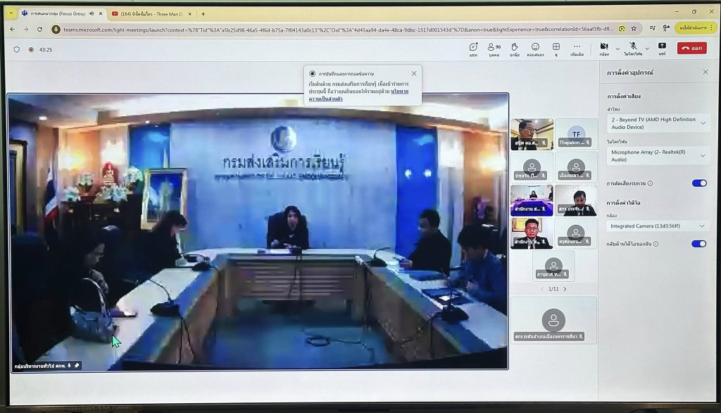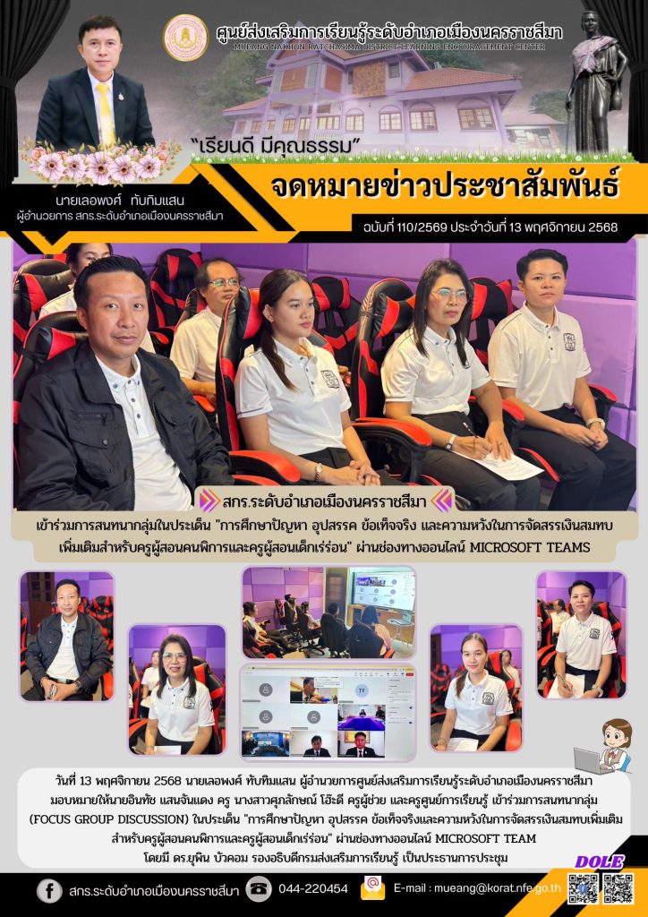 วันที่ 13 พฤศจิกายน 2568 นายเลอพงศ์ ทับทิมแสน ผู้อำนวยการศูนย์ส่งเสริมการเรียนรู้ระดับอำเภอเมืองนครราชสีมามอบหมายให้นายอินทัช แสนจันแดง ครู นางสาวศุภลักษณ์ โฮ๊ะดี ครูผู้ช่วย และครูศูนย์การเรียนรู้ เข้าร่วมการสนทนากลุ่ม (Focus Group Discussion) ในประเด็น “การศึกษาปัญหา อุปสรรค ข้อเท็จจริงและความหวังในการจัดสรรเงินสมทบเพิ่มเติมสำหรับครูผู้สอนคนพิการและครูผู้สอนเด็กเร่ร่อน” ผ่านช่องทางออนไลน์ Microsoft Team โดยมี ดร.ยุพิน บัวคอม รองอธิบดีกรมส่งเสริมการเรียนรู้ เป็นประธานการประชุม