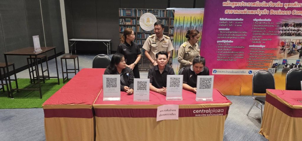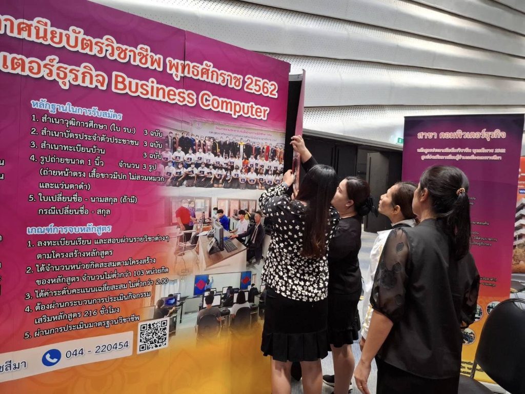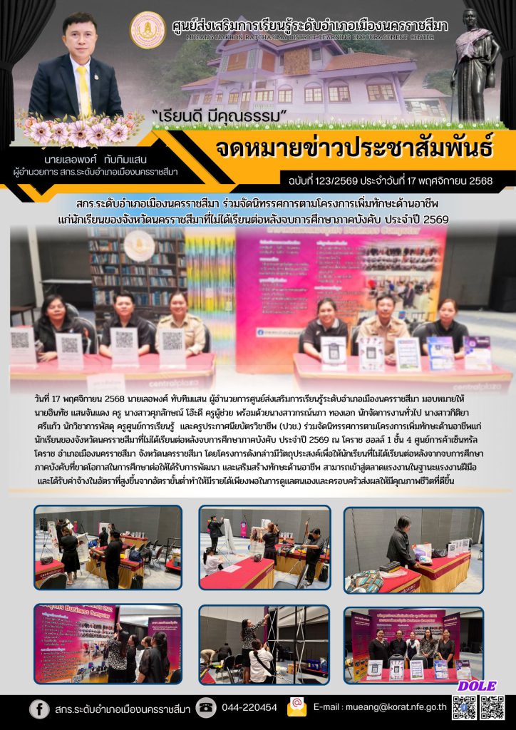 วันที่ 17 พฤศจิกายน 2568 นายเลอพงศ์ ทับทิมแสน ผู้อำนวยการศูนย์ส่งเสริมการเรียนรู้ระดับอำเภอเมืองนครราชสีมา มอบหมายให้ นายอินทัช แสนจันแดง ครู นางสาวศุภลักษณ์ โฮ๊ะดี ครูผู้ช่วย พร้อมด้วยนางสาวกรณ์นภา ทองเอก นักจัดการงานทั่วไป นางสาวกิติยา ศรีแก้ว นักวิชาการพัสดุ ครูศูนย์การเรียนรู้ และครูประกาศนียบัตรวิชาชีพ (ปวช.) ร่วมจัดนิทรรศการตามโครงการเพิ่มทักษะด้านอาชีพแก่นักเรียนของจังหวัดนครราชสีมาที่ไม่ได้เรียนต่อหลังจบการศึกษาภาคบังคับ ประจำปี 2569 ณ โคราช ฮอลล์ 1 ชั้น 4 ศูนย์การค้าเซ็นทรัล โคราช อำเภอเมืองนครราชสีมา จังหวัดนครราชสีมา โดยโครงการดังกล่าวมีวัตถุประสงค์เพื่อให้นักเรียนที่ไม่ได้เรียนต่อหลังจากจบการศึกษาภาคบังคับที่ขาดโอกาสในการศึกษาต่อให้ได้รับการพัฒนา และเสริมสร้างทักษะด้านอาชีพ สามารถเข้าสู่ตลาดแรงงานในฐานะแรงงานฝีมือและได้รับค่าจ้างในอัตราที่สูงขึ้นจากอัตราขั้นต่ำทำให้มีรายได้เพียงพอในการดูแลตนเองและครอบครัวส่งผลให้มีคุณภาพชีวิตที่ดีขึ้น