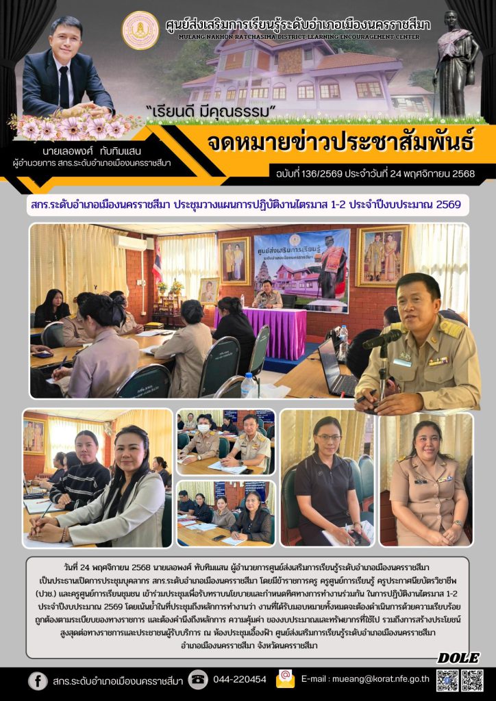 วันที่ 24 พฤศจิกายน 2568 นายเลอพงศ์ ทับทิมแสน ผู้อำนวยการศูนย์ส่งเสริมการเรียนรู้ระดับอำเภอเมืองนครราชสีมา เป็นประธานเปิดการประชุมบุคลากร สกร.ระดับอำเภอเมืองนครราชสีมา โดยมีข้าราชการครู ครูศูนย์การเรียนรู้ ครูประกาศนียบัตรวิชาชีพ (ปวช.) และครูศูนย์การเรียนชุมชน เข้าร่วมประชุมเพื่อรับทราบนโยบายและกำหนดทิศทางการทำงานร่วมกัน ในการปฏิบัติงานไตรมาส 1-2 ประจำปีงบประมาณ 2569 โดยเน้นย้ำในที่ประชุมถึงหลักการทำงานว่า งานที่ได้รับมอบหมายทั้งหมดจะต้องดำเนินการด้วยความเรียบร้อย ถูกต้องตามระเบียบของทางราชการ และต้องคำนึงถึงหลักการ ความคุ้มค่า ของงบประมาณและทรัพยากรที่ใช้ไป รวมถึงการสร้างประโยชน์สูงสุดต่อทางราชการและประชาชนผู้รับบริการ ณ ห้องประชุมเอื้องฟ้า ศูนย์ส่งเสริมการเรียนรู้ระดับอำเภอเมืองนครราชสีมา อำเภอเมืองนครราชสีมา จังหวัดนครราชสีมา