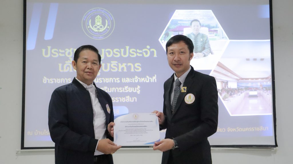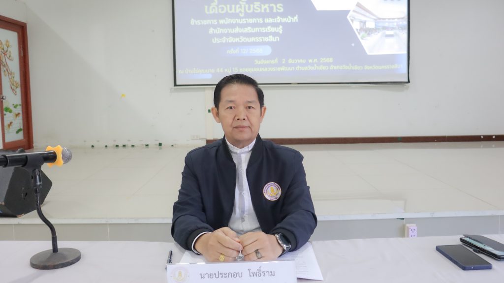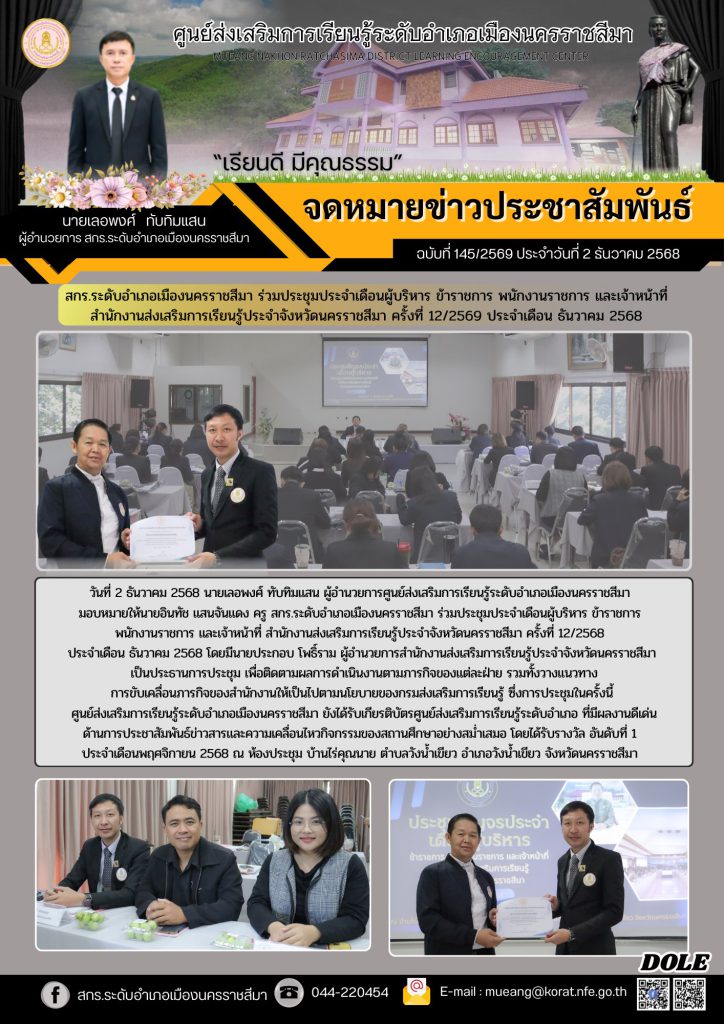 วันที่ 2 ธันวาคม 2568 นายเลอพงศ์ ทับทิมแสน ผู้อำนวยการศูนย์ส่งเสริมการเรียนรู้ระดับอำเภอเมืองนครราชสีมา มอบหมายให้นายอินทัช แสนจันแดง ครู สกร.ระดับอำเภอเมืองนครราชสีมา ร่วมประชุมประจำเดือนผู้บริหาร ข้าราชการ พนักงานราชการ และเจ้าหน้าที่ สำนักงานส่งเสริมการเรียนรู้ประจำจังหวัดนครราชสีมา ครั้งที่ 12/2568 ประจำเดือน ธันวาคม 2568 โดยมีนายประกอบ โพธิ์ราม ผู้อำนวยการสำนักงานส่งเสริมการเรียนรู้ประจำจังหวัดนครราชสีมา เป็นประธานการประชุม เพื่อติดตามผลการดำเนินงานตามภารกิจของแต่ละฝ่าย รวมทั้งวางแนวทางการขับเคลื่อนภารกิจของสำนักงานให้เป็นไปตามนโยบายของกรมส่งเสริมการเรียนรู้ ซึ่งการประชุมในครั้งนี้ ศูนย์ส่งเสริมการเรียนรู้ระดับอำเภอเมืองนครราชสีมา ยังได้รับเกียรติบัตรศูนย์ส่งเสริมการเรียนรู้ระดับอำเภอ ที่มีผลงานดีเด่นด้านการประชาสัมพันธ์ข่าวสารและความเคลื่อนไหวกิจกรรมของสถานศึกษาอย่างสม่ำเสมอ โดยได้รับรางวัล อันดับที่ 1 ประจำเดือนพฤศจิกายน 2568 ณ ห้องประชุม บ้านไร่คุณนาย ตำบลวังน้ำเขียว อำเภอวังน้ำเขียว จังหวัดนครราชสีมา