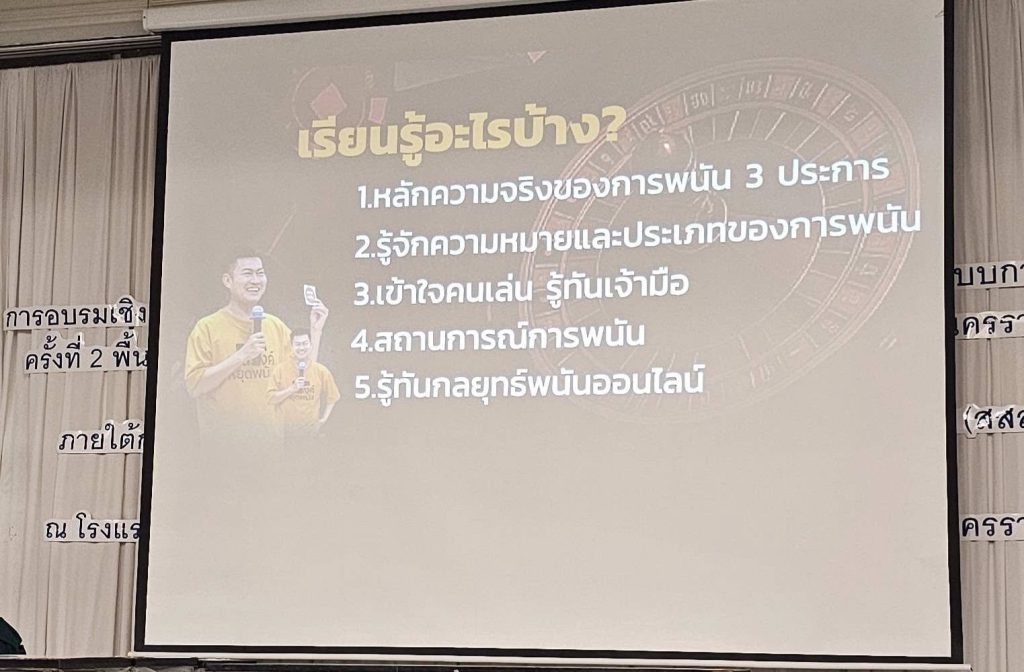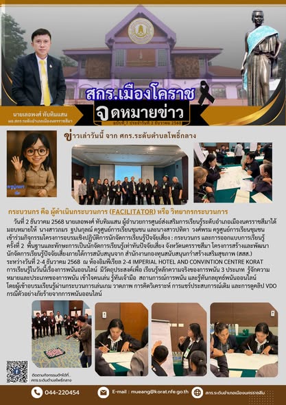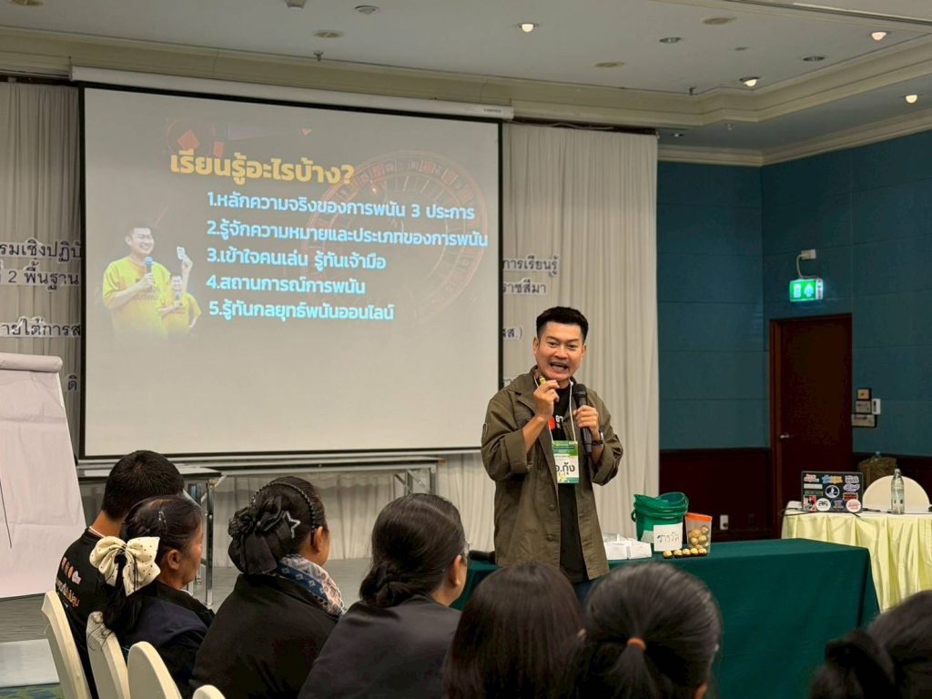 วันที่ 2 ธันวาคม 2568 นายเลอพงศ์ ทับทิมแสน ผู้อำนวยการศูนย์ส่งเสริมการเรียนรู้ระดับอำเภอเมืองนครราชสีมาได้มอบหมายให้ นางสาวภมร ฐปนกุลณ์ ครูศูนย์การเรียนชุมชน และนางสาวปทิตา วงศ์พรม ครูศูนย์การเรียนชุมชน เข้าร่วมกิจกรรมโครงการอบรมเชิงปฏิบัติการนักจัดการเรียนรู้ปัจจัยเสี่ยง : กระบวนกร และการออกแบบการเรียนรู้ ครั้งที่ 2 พื้นฐานและทักษะการเป็นนักจัดการเรียนรู้เท่าทันปัจจัยเสี่ยง จังหวัดนครราชสีมา โครงการสร้างและพัฒนา นักจัดการเรียนรู้ปัจจัยเสี่ยงภายใต้การสนับสนุนจาก สำนักงานกองทุนสนับสนุนกาำสร้างเสริมสุขภาพ (สสส.) ระหว่างวันที่ 2-4 ธันวาคม 2568 ณ ห้องอิมพีเรียล 2-4 IMPERIAL HOTEL AND CONVINTION CENTRE KORAT การเรียนรู้ในวันนี้เรื่องการพนันออนไลน์ มีวัตถุประสงค์เพื่อ เรียนรู้หลักความจริงของการพนัน 3 ประเภท รู้จักความหมายและประเภทของการพนัน เข้าใจคนเล่น รู้ทันเจ้ามือ สถานการณ์การพนัน และรู้ทันกลยุทธ์พนันออนไลน์ โดยผู้เข้าอบรมเรียนรู้ผ่านกระบวนการเล่นเกม วาดภาพ การคิดวิเคราะห์ การแชร์ประสบการณ์เดิม และการดูคลิป VDO กรณีตัวอย่างภัยร้ายจากการพนันออนไลน์