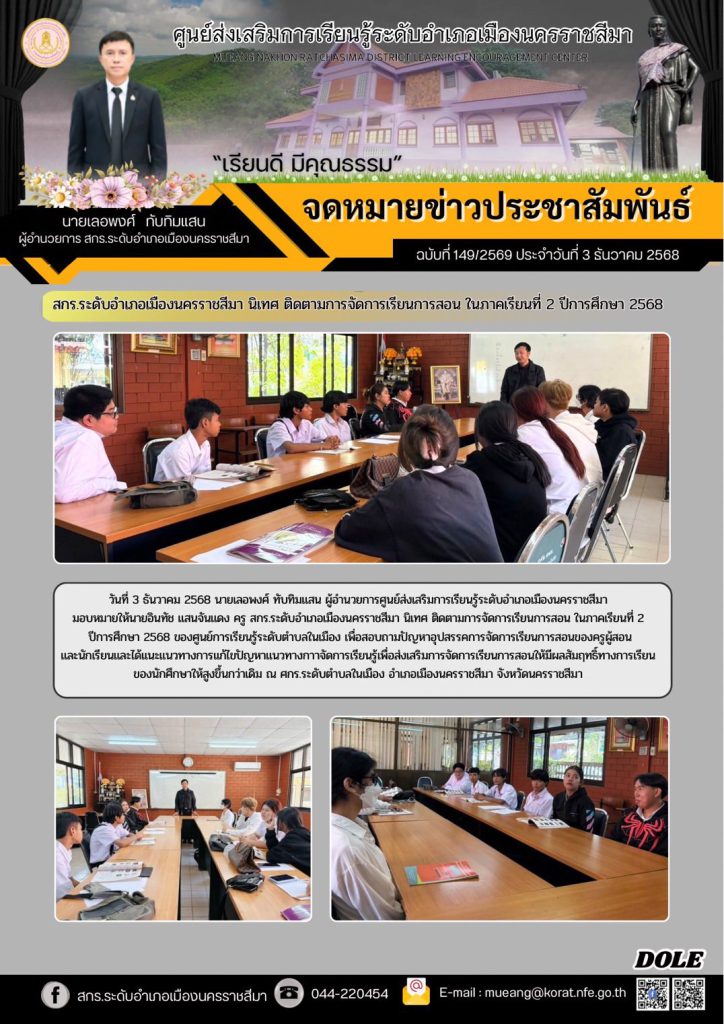 วันที่ 3 ธันวาคม 2568 นายเลอพงศ์ ทับทิมแสน ผู้อำนวยการศูนย์ส่งเสริมการเรียนรู้ระดับอำเภอเมืองนครราชสีมามอบหมายให้นายอินทัช แสนจันแดง ครู สกร.ระดับอำเภอเมืองนครราชสีมา นิเทศ ติดตามการจัดการเรียนการสอน ในภาคเรียนที่ 2 ปีการศึกษา 2568 ของศูนย์การเรียนรู้ระดับตำบลในเมือง เพื่อสอบถามปัญหาอุปสรรคการจัดการเรียนการสอนของครูผู้สอนและนักเรียนและได้แนะแนวทางการแก้ไขปัญหาแนวทางกาาจัดการเรียนรู้เพื่อส่งเสริมการจัดการเรียนการสอนให้มีผลสัมฤทธิ์ทางการเรียนของนักศึกษาให้สูงขึ้นกว่าเดิม ณ ศกร.ระดับตำบลในเมือง อำเภอเมืองนครราชสีมา จังหวัดนครราชสีมา
