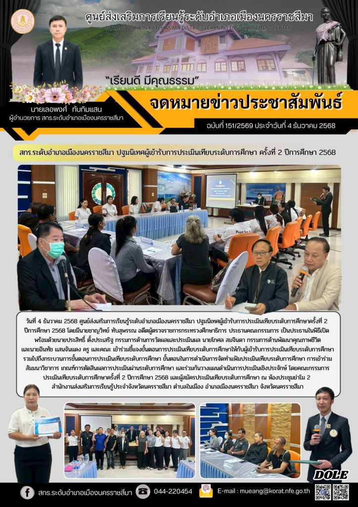 วันที่ 4 ธันวาคม 2568 ศูนย์ส่งเสริมการเรียนรู้ระดับอำเภอเมืองนครราชสีมา ปฐมนิเทศผู้เข้ารับการประเมินเทียบระดับการศึกษาครั้งที่ 2 ปีการศึกษา 2568 โดยมีนายชาญวิทย์ ทับสุพรรณ อดีตผู้ตรวจราชการกระทรวงศึกษาธิการ ประธานคณะกรรมการ เป็นประธานในพิธีเปิด พร้อมด้วยนายประสิทธิ์ ตั้งประเสริฐ กรรมการด้านการวัดผลและประเมินผล นายโกศล สมจินดา กรรมการด้านพัฒนาคุณภาพชีวิต และนายอินทัช แสนจันแดง ครู และคณะ เข้าร่วมชี้แจงขั้นตอนการประเมินเทียบระดับการศึกษาให้กับผู้เข้ารับการประเมินเทียบระดับการศึกษา รวมไปถึงกระบวนการขั้นตอนการประเมินเทียบระดับการศึกษา ขั้นตอนในการดำเนินการจัดทำแฟ้มประเมินเทียบระดับการศึกษา การเข้าร่วมสัมมนาวิชาการ เกณฑ์การตัดสินผลการประเมินผ่านระดับการศึกษา และร่วมกันวางแผนดำเนินการประเมินเชิงประจักษ์ โดยคณะกรรมการประเมินเทียบระดับการศึกษาครั้งที่ 2 ปีการศึกษา 2568 และผู้สมัครประเมินเทียบระดับการศึกษา ณ ห้องประชุมย่าโม 2 สำนักงานส่งเสริมการเรียนรู้ประจำจังหวัดนครราชสีมา ตำบลในเมือง อำเภอเมืองนครราชสีมา จังหวัดนครราชสีมา