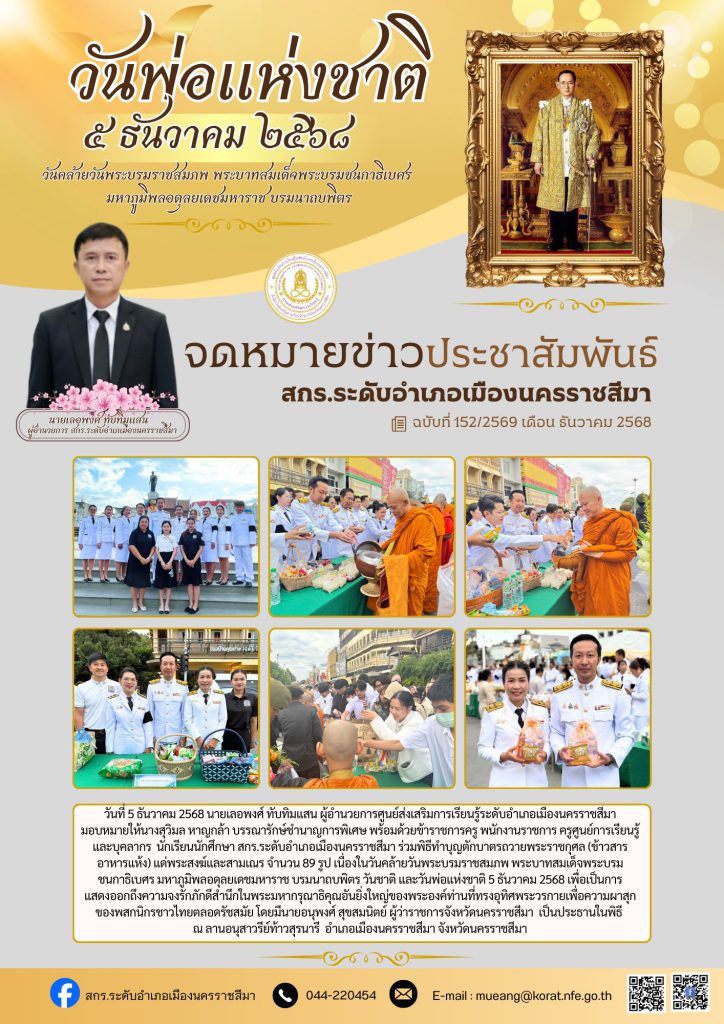 วันที่ 5 ธันวาคม 2568 นายเลอพงศ์ ทับทิมแสน ผู้อำนวยการศูนย์ส่งเสริมการเรียนรู้ระดับอำเภอเมืองนครราชสีมา มอบหมายให้นางสุวิมล หาญกล้า บรรณารักษ์ชำนาญการพิเศษ พร้อมด้วยข้าราชการครู พนักงานราชการ ครูศูนย์การเรียนรู้ และบุคลากร นักเรียนนักศึกษา สกร.ระดับอำเภอเมืองนครราชสีมา ร่วมพิธีทำบุญตักบาตรถวายพระราชกุศล (ข้าวสารอาหารแห้ง) แด่พระสงฆ์และสามเณร จำนวน 89 รูป เนื่องในวันคล้ายวันพระบรมราชสมภพ พระบาทสมเด็จพระบรมชนกาธิเบศร มหาภูมิพลอดุลยเดชมหาราช บรมนาถบพิตร วันชาติ และวันพ่อแห่งชาติ 5 ธันวาคม 2568 เพื่อเป็นการแสดงออกถึงความจงรักภักดีสำนึกในพระมหากรุณาธิคุณอันยิ่งใหญ่ของพระองค์ท่านที่ทรงอุทิศพระวรกายเพื่อความผาสุกของพสกนิกรชาวไทยตลอดรัชสมัย โดยมีนายอนุพงศ์ สุขสมนิตย์ ผู้ว่าราชการจังหวัดนครราชสีมา เป็นประธานในพิธี ณ ลานอนุสาวรีย์ท้าวสุรนารี อำเภอเมืองนครราชสีมา จังหวัดนครราชสีมา
