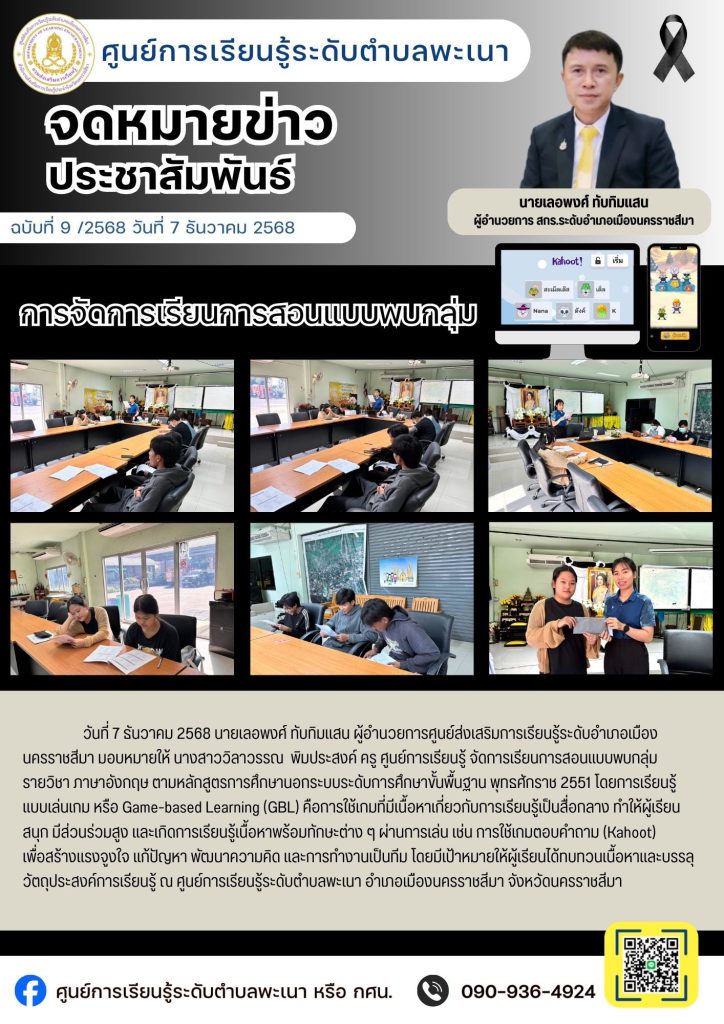 เรียน นายเลอพงศ์ ทับทิมแสน ผู้อำนวยการศูนย์ส่งเสริมการเรียนรู้ระดับอำเภอเมืองนครราชสีมา วันที่ 7 ธันวาคม 2568 นายเลอพงศ์ ทับทิมแสน ผู้อำนวยการศูนย์ส่งเสริมการเรียนรู้ระดับอำเภอเมืองนครราชสีมา มอบหมายให้ นางสาววิลาวรรณ พิมประสงค์ ครู ศูนย์การเรียนรู้ จัดการเรียนการสอนแบบพบกลุ่ม รายวิชา ภาษาอังกฤษ ตามหลักสูตรการศึกษานอกระบบระดับการศึกษาขั้นพื้นฐาน พุทธศักราช 2551 โดยการเรียนรู้แบบเล่นเกม หรือ Game-based Learning (GBL) คือการใช้เกมที่มีเนื้อหาเกี่ยวกับการเรียนรู้เป็นสื่อกลาง ทำให้ผู้เรียนสนุก มีส่วนร่วมสูง และเกิดการเรียนรู้เนื้อหาพร้อมทักษะต่าง ๆ ผ่านการเล่น เช่น การใช้เกมตอบคำถาม (Kahoot) เพื่อสร้างแรงจูงใจ แก้ปัญหา พัฒนาความคิด และการทำงานเป็นทีม โดยมีเป้าหมายให้ผู้เรียนได้ทบทวนเนื้อหาและบรรลุวัตถุประสงค์การเรียนรู้ ณ ศูนย์การเรียนรู้ระดับตำบลพะเนา อำเภอเมืองนครราชสีมา จังหวัดนครราชสีมา