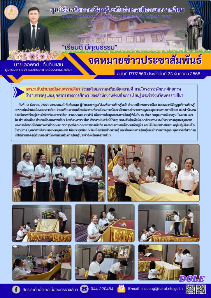วันที่ 23 ธันวาคม 2568 นายเลอพงศ์ ทับทิมแสน ผู้อำนวยการศูนย์ส่งเสริมการเรียนรู้ระดับอำเภอเมืองนครราชสีมา มอบหมายให้ครูศูนย์การเรียนรู้ สกร.ระดับอำเภอเมืองนครราชสีมา ร่วมเตรียมความพร้อมจัดสถานที่ตามโครงการพัฒนาศักยภาพข้าราชการครูและบุคลากรทางการศึกษา ของสำนักงานส่งเสริมการเรียนรู้ประจำจังหวัดนครราชสีมา ตามแนวพระราชดำริ เพื่อยกระดับคุณภาพการเรียนรู้ที่ยั่งยืน ณ ห้องประชุมแกรนด์บอลรูม โรงแรม เดอะริช ตำบลในเมือง อำเภอเมืองนครราชสีมา จังหวัดนครราชสีมา กิจกรรมในครั้งนี้มีวัตถุประสงค์หลักเพื่อพัฒนาศักยภาพของข้าราชการครูและบุคลากรทางการศึกษาให้เกิดความสำนึกในพระมหากรุณาธิคุณในพระราชกรณ๊ยกิจ ของพระบาทสมเด็จพระเจ้าอยู่หัว และได้นำแนวทางไปประพฤติปฏิบัติตนเป็นข้าราชการ บุคลากรที่ดีตามรอยพระยุคลบาท ได้อย่างถูกต้อง พร้อมทั้งเสริมสร้างความรู้ และทักษะในการเรียนรู้ของข้าราชการครูและบุคลากรให้สามารถนำไปถ่ายทอดสู่ผู้เรียนของสำนักงานส่งเสริมการเรียนรู้ประจำจังหวัดนครราชสีมา