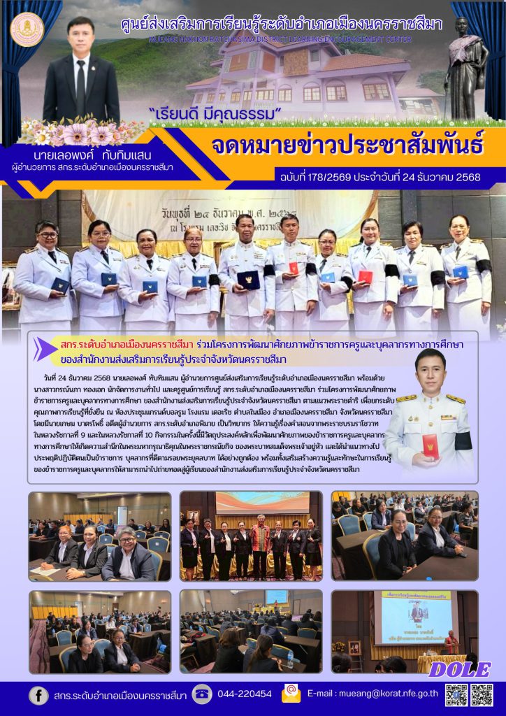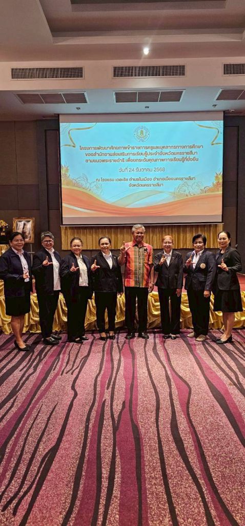 วันที่ 24 ธันวาคม 2568 นายเลอพงศ์ ทับทิมแสน ผู้อำนวยการศูนย์ส่งเสริมการเรียนรู้ระดับอำเภอเมืองนครราชสีมา พร้อมด้วย นางสาวกรณ์นภา ทองเอก นักจัดการงานทั่วไป และครูศูนย์การเรียนรู้ สกร.ระดับอำเภอเมืองนครราชสีมา ร่วมโครงการพัฒนาศักยภาพข้าราชการครูและบุคลากรทางการศึกษา ของสำนักงานส่งเสริมการเรียนรู้ประจำจังหวัดนครราชสีมา ตามแนวพระราชดำริ เพื่อยกระดับคุณภาพการเรียนรู้ที่ยั่งยืน ณ ห้องประชุมแกรนด์บอลรูม โรงแรม เดอะริช ตำบลในเมือง อำเภอเมืองนครราชสีมา จังหวัดนครราชสีมา โดยมีนายเกษม บาตรโพธิ์ อดีตผู้อำนวยการ สกร.ระดับอำเภอพิมาย เป็นวิทยากร ให้ความรู้เรื่องคำสอนจากพระราชบรมราโชวาทในหลวงรัชกาลที่ 9 และในหลวงรัชกาลที่ 10 กิจกรรมในครั้งนี้มีวัตถุประสงค์หลักเพื่อพัฒนาศักยภาพของข้าราชการครูและบุคลากรทางการศึกษาให้เกิดความสำนึกในพระมหากรุณาธิคุณในพระราชกรณ๊ยกิจ ของพระบาทสมเด็จพระเจ้าอยู่หัว และได้นำแนวทางไปประพฤติปฏิบัติตนเป็นข้าราชการ บุคลากรที่ดีตามรอยพระยุคลบาท ได้อย่างถูกต้อง พร้อมทั้งเสริมสร้างความรู้และทักษะในการเรียนรู้ของข้าราชการครูและบุคลากรให้สามารถนำไปถ่ายทอดสู่ผู้เรียนของสำนักงานส่งเสริมการเรียนรู้ประจำจังหวัดนครราชสีมา