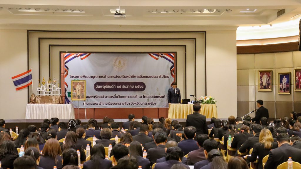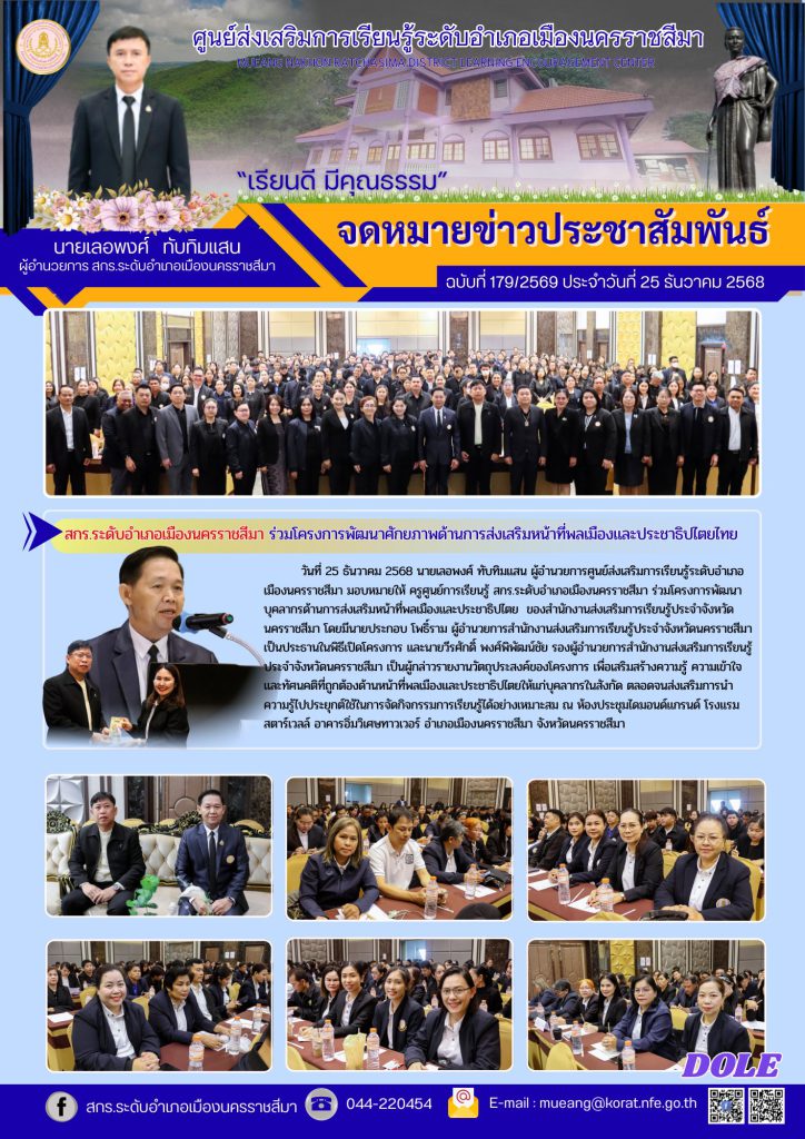 วันที่ 25 ธันวาคม 2568 นายเลอพงศ์ ทับทิมแสน ผู้อำนวยการศูนย์ส่งเสริมการเรียนรู้ระดับอำเภอเมืองนครราชสีมา มอบหมายให้ ครูศูนย์การเรียนรู้ สกร.ระดับอำเภอเมืองนครราชสีมา ร่วมโครงการพัฒนาบุคลากรด้านการส่งเสริมหน้าที่พลเมืองและประชาธิปไตย ของสำนักงานส่งเสริมการเรียนรู้ประจำจังหวัดนครราชสีมา โดยมีนายประกอบ โพธิ์ราม ผู้อำนวยการสำนักงานส่งเสริมการเรียนรู้ประจำจังหวัดนครราชสีมา เป็นประธานในพิธีเปิดโครงการ และนายวีรศักดิ์ พงศ์พิพัฒน์ชัย รองผู้อำนวยการสำนักงานส่งเสริมการเรียนรู้ประจำจังหวัดนครราชสีมา เป็นผู้กล่าวรายงานวัตถุประสงค์ของโครงการ เพื่อเสริมสร้างความรู้ ความเข้าใจ และทัศนคติที่ถูกต้องด้านหน้าที่พลเมืองและประชาธิปไตยให้แก่บุคลากรในสังกัด ตลอดจนส่งเสริมการนำ ความรู้ไปประยุกต์ใช้ในการจัดกิจกรรมการเรียนรู้ได้อย่างเหมาะสม ณ ห้องประชุมไดมอนด์แกรนด์ โรงแรม สตาร์เวลล์ อาคารอิ่มวิเศษทาวเวอร์ อำเภอเมืองนครราชสีมา จังหวัดนครราชสีมา