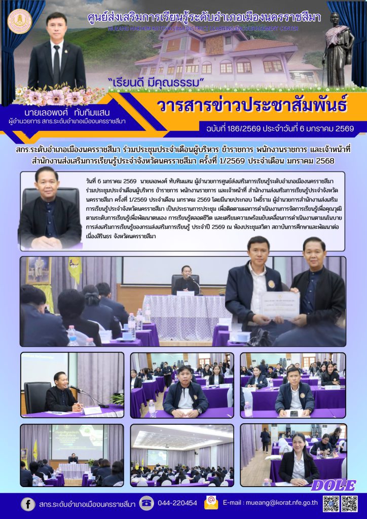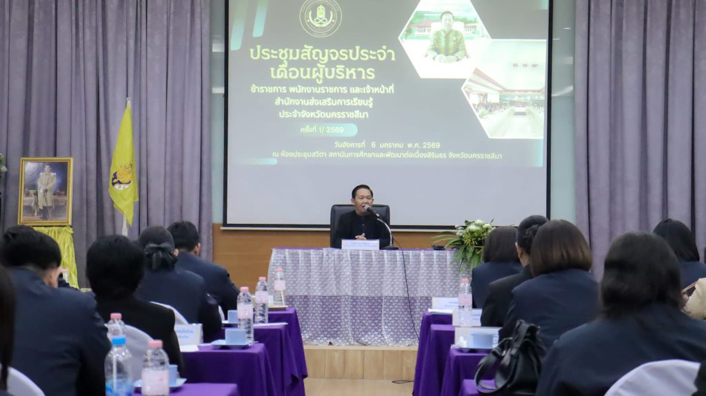 วันที่ 6 มกราคม 2569 นายเลอพงศ์ ทับทิมแสน ผู้อำนวยการศูนย์ส่งเสริมการเรียนรู้ระดับอำเภอเมืองนครราชสีมา ร่วมประชุมประจำเดือนผู้บริหาร ข้าราชการ พนักงานราชการ และเจ้าหน้าที่ สำนักงานส่งเสริมการเรียนรู้ประจำจังหวัดนครราชสีมา ครั้งที่ 1/2569 ประจำเดือน มกราคม 2569 โดยมีนายประกอบ โพธิ์ราม ผู้อำนวยการสำนักงานส่งเสริมการเรียนรู้ประจำจังหวัดนครราชสีมา เป็นประธานการประชุม เพื่อติดตามผลการดำเนินงานการจัดการเรียนรู้เพื่อคุณวุฒิตามระดับการเรียนรู้เพื่อพัฒนาตนเอง การเรียนรู้ตลอดชีวิต และเตรียมความพร้อมขับเคลื่อนการดำเนินงานตามนโนบายการส่งเสริมการเรียนรู้ของกรมส่งเสริมการเรียนรู้ ประจำปี 2569 ณ ห้องประชุมสวิตา สถาบันการศึกษาและพัฒนาต่อเนื่องสิรินธร จังหวัดนครราชสีมา