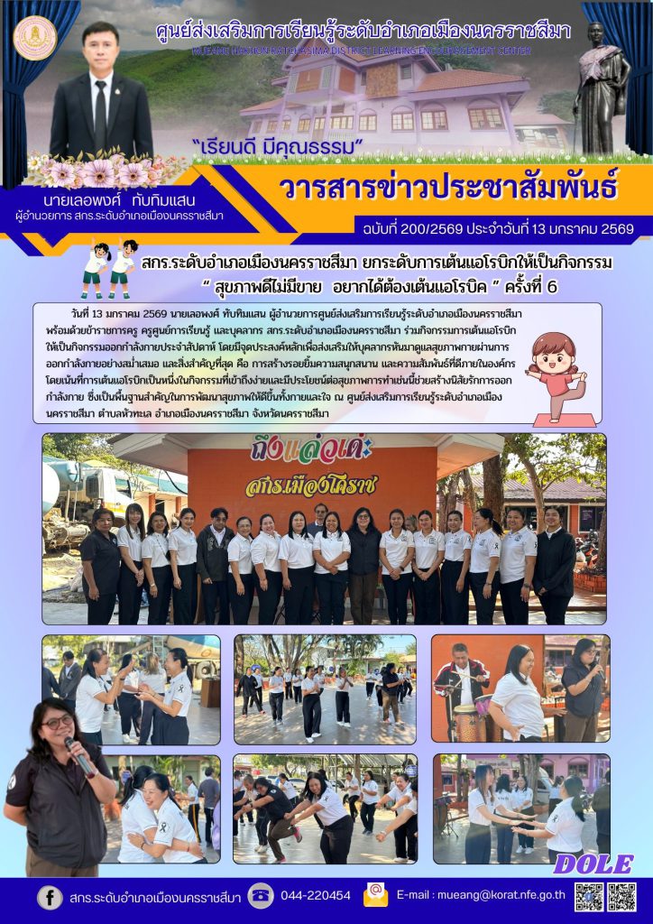 วันที่ 13 มกราคม 2569 นายเลอพงศ์ ทับทิมแสน ผู้อำนวยการศูนย์ส่งเสริมการเรียนรู้ระดับอำเภอเมืองนครราชสีมา พร้อมด้วยข้าราชการครู ครูศูนย์การเรียนรู้ และบุคลากร สกร.ระดับอำเภอเมืองนครราชสีมา ร่วมกิจกรรมการเต้นแอโรบิกให้เป็นกิจกรรมออกกำลังกายประจำสัปดาห์ โดยมีจุดประสงค์หลักเพื่อส่งเสริมให้บุคลากรหันมาดูแลสุขภาพกายผ่านการออกกำลังกายอย่างสม่ำเสมอ และสิ่งสำคัญที่สุด คือ การสร้างรอยยิ้มความสนุกสนาน และความสัมพันธ์ที่ดีภายในองค์กร โดยเน้นที่การเต้นแอโรบิกเป็นหนึ่งในกิจกรรมที่เข้าถึงง่ายและมีประโยชน์ต่อสุขภาพการทำเช่นนี้ช่วยสร้างนิสัยรักการออกกำลังกาย ซึ่งเป็นพื้นฐานสำคัญในการพัฒนาสุขภาพให้ดีขึ้นทั้งกายและใจ ณ ศูนย์ส่งเสริมการเรียนรู้ระดับอำเภอเมืองนครราชสีมา ตำบลหัวทะเล อำเภอเมืองนครราชสีมา จังหวัดนครราชสีมา