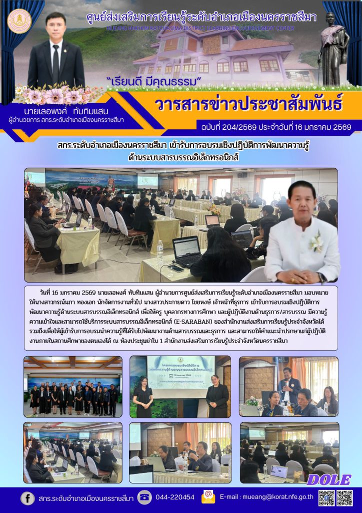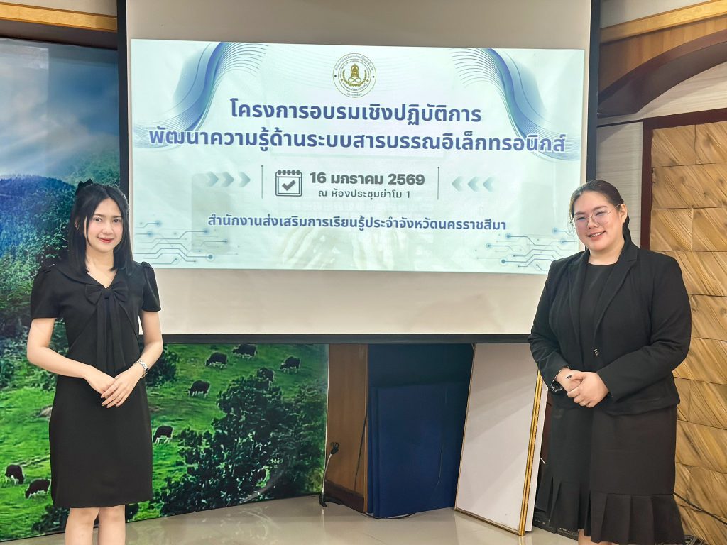 วันที่ 16 มกราคม 2569 นายเลอพงศ์ ทับทิมแสน ผู้อำนวยการศูนย์ส่งเสริมการเรียนรู้ระดับอำเภอเมืองนครราชสีมา มอบหมายให้นางสาวกรณ์นภา ทองเอก นักจัดการงานทั่วไป นางสาวประกายดาว ไชยหงษ์ เจ้าหน้าที่ธุรการ เข้ารับการอบรมเชิงปฏิบัติการพัฒนาความรู้ด้านระบบสารบรรณอิเล็กทรอนิกส์ เพื่อให้ครู บุคลากรทางการศึกษา และผู้ปฏิบัติงานด้านธุรการ/สารบรรณ มีความรู้ความเข้าใจและสามารถใช้บริการระบบสารบรรณอิเล็กทรอนิกส์ (e-SARABAN) ของสำนักงานส่งเสริมการเรียนรู้ประจำจังหวัดได้ รวมถึงเพื่อให้ผู้เข้ารับการอบรมนำความรู้ที่ได้รับไปพัฒนางานด้านสารบรรณและธุรการ และสามารถให้คำแนะนำปรกษาแก่ผู้ปฏิบัติงานภายในสถานศึกษาของตนเองได้ ณ ห้องประชุมย่าโม 1 สำนักงานส่งเสริมการเรียนรู้ประจำจังหวัดนครราชสีมา