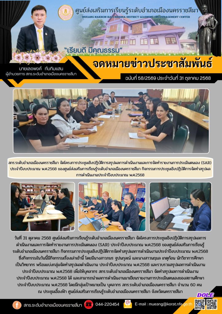วันที่ 31 ตุลาคม 2568 ศูนย์ส่งเสริมการเรียนรู้ระดับอำเภอเมืองนครราชสีมา จัดโครงการประชุมเชิงปฏิบัติการสรุปผลการดำเนินงานและการจัดทำรายงานการประเมินตนเอง (SAR) ประจำปีงบประมาณ พ.ศ.2568 ของศูนย์ส่งเสริมการเรียนรู้ระดับอำเภอเมืองนครราชสีมา กิจกรรมการประชุมเชิงปฏิบัติการจัดทำสรุปผลการดำเนินงานประจำปีงบประมาณ พ.ศ.2568 ซึ่งกิจกรรมในวันนี้มีกิจกรรมเรื่องเล่าเช้านี้ โดยมีนางสาวภมร ฐปนกุลณ์ และนางสาวนฤมล เกตุก้อน นักวิชาการศึกษา เป็นวิทยากร พร้อมแบ่งกลุ่มจัดทำสรุปผลดำเนินงาน ประจำปีงบประมาณ พ.ศ.2568 และรวบรวมสรุปผลการดำเนินงาน ประจำปีงบประมาณ พ.ศ.2568 เพื่อให้บุคลากร สกร.ระดับอำเภอเมืองนครราชสีมา จัดทำสรุปผลการดำเนินงาน ประจำปีงบประมาณ พ.ศ.2568 ได้ และสามารถนำผลการดำเนินงานมาเขียนรายงานการประเมินตนเองของสถานศึกษา ประจำปีงบประมาณ พ.ศ.2568 โดยมีกลุ่มเป้าหมายเป็น บุคลากร สกร.ระดับอำเภอเมืองนครราชสีมา จำนวน 60 คน ณ ประชุมเอื้องฟ้า ศูนย์ส่งเสริมการเรียนรู้ระดับอำเภอเมืองนครราชสีมา จังหวัดนครราชสีมา