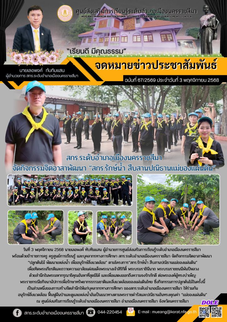 วันที่ 3 พฤศจิกายน 2568 นายเลอพงศ์ ทับทิมแสน ผู้อำนวยการศูนย์ส่งเสริมการเรียนรู้ระดับอำเภอเมืองนครราชสีมา พร้อมด้วยข้าราชการครู ครูศูนย์การเรียนรู้ และบุคลากรทางการศึกษา สกร.ระดับอำเภอเมืองนครราชสีมา จัดกิจกรรมจิตอาสาพัฒนา “ปลูกต้นไม้ พัฒนาแหล่งน้ำ เพื่ออนุรักษ์สิ่งแวดล้อม” ตามโครงการ “สกร.รักษ์น้ำ สืบสานปณิธานแม่ของแผ่นดิน” เพื่อเทิดพระเกียรติและถวายความอาลัยแด่สมเด็จพระนางเจ้าสิริกิติ์ พระบรมราชินีนาถ พระบรมราชชนนีพันปีหลวงด้วยสำนึกในพระมหากรุณาธิคุณอันหาที่สุดมิได้ และเพื่อแสดงออกถึงความจงรักภักดี ต่อพระองค์ผู้ทรงบำเพ็ญพระราชกรณียกิจนานัปการเพื่อรักษาทรัพยากรธรรมชาติและสิ่งแวดล้อมของแผ่นดินไทย ซึ่งกิจกรรมการปลูกต้นไม้ในครั้งนี้เป็นส่วนหนึ่งของการสร้างจิตสำนึกให้แก่บุคลากรทางการศึกษาของ สกร.ระดับอำเภอเมืองนครราชสีมา ให้ร่วมกันอนุรักษ์สิ่งแวดล้อม ฟื้นฟูผืนป่าและดูแลแหล่งน้ำอันเป็นแนวทางตามพระราชดำรัสและปณิธานอันทรงคุณค่า “แม่ของแผ่นดิน” ณ ศูนย์ส่งเสริมการเรียนรู้ระดับอำเภอเมืองนครราชสีมา อำเภอเมืองนครราชสีมา จังหวัดนครราชสีมา
