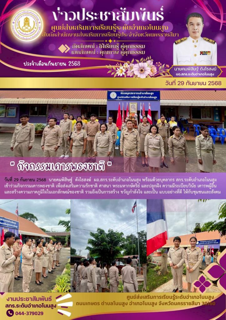 วันจันทร์ที่ 29 กันยายน 2568นายคมพิสิษฐ์ ดังไธสงฆ์ ผู้อำนวยการศูนย์ส่งเสริมการเรียนรู้ระดับอำเภอโนนสูง เป็นประธานในการจัดกิจกรรมวันพระราชทานธงชาติไทย 28 กันยายน ประจำปี 2568 (ครบรอบ 108 ปี) พร้อมด้วยคณะครู และบุคลากร สกร.ระดับอำเภอโนนสูง เข้าร่วมกิจกรรมเคารพธงชาติไทยและร้องเพลงชาติไทยโดยพร้อมเพรียงกัน เวลา 08:00 น. ณ บริเวณหน้าเสาธงหน้าห้องสมุดประชาชนอำเภอโนนสูง เพื่อเป็นการสร้างความภาคภูมิใจของคนในชาติ และเป็นการน้อมรำลึกในพระมหากรุณาธิคุณของพระบาทสมเด็จพระมงกุฎเกล้าเจ้าอยู่หัว ที่ทรงพระราชทาน “ธงไตรรงค์” เป็นธงชาติไทย 🇹🇭✨✨ทั้งนี้ วันพระราชทานธงชาติไทย (Thai National Flag Day) 🇹🇭 เป็นวันที่ระลึกถึงโอกาสที่พระบาทสมเด็จพระมงกุฎเกล้าเจ้าอยู่หัว ทรงพระกรุณาโปรดเกล้าฯ ประกาศพระราชบัญญัติแก้ไขพระราชบัญญัติธง พระพุทธศักราช 2460 โดยมีสาระสำคัญคือ การประกาศให้ธงไตรรงค์เป็นธงชาติไทยสืบต่อมาจนถึงปัจจุบัน ซึ่งได้มีการประกาศไว้ ณ วันที่ 28 กันยายน พ.ศ. 2460✨🇹🇭🥰✅